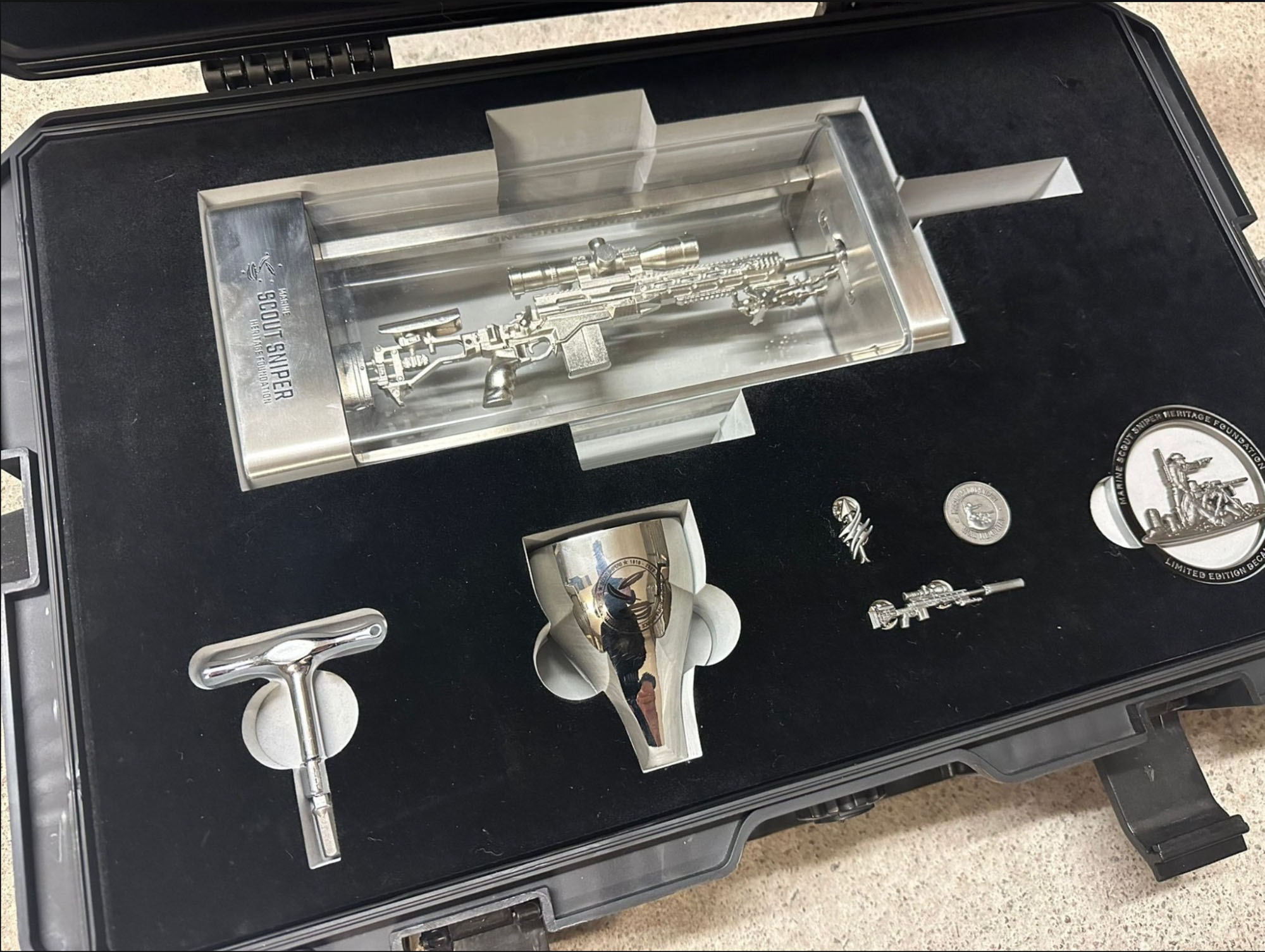 To raise the funds to construct the bronze statue, which is being done by Sabin Howard who created the National World War I Memorial, the foundation is also selling Scout Sniper-themed flasks and decanters. (Remember that the Marine Corps birthplace was the Tun Tavern in Philadelphia on November 10, 1775, and is our military’s oldest service branch.) Both the flask and decanter are limited edition items.