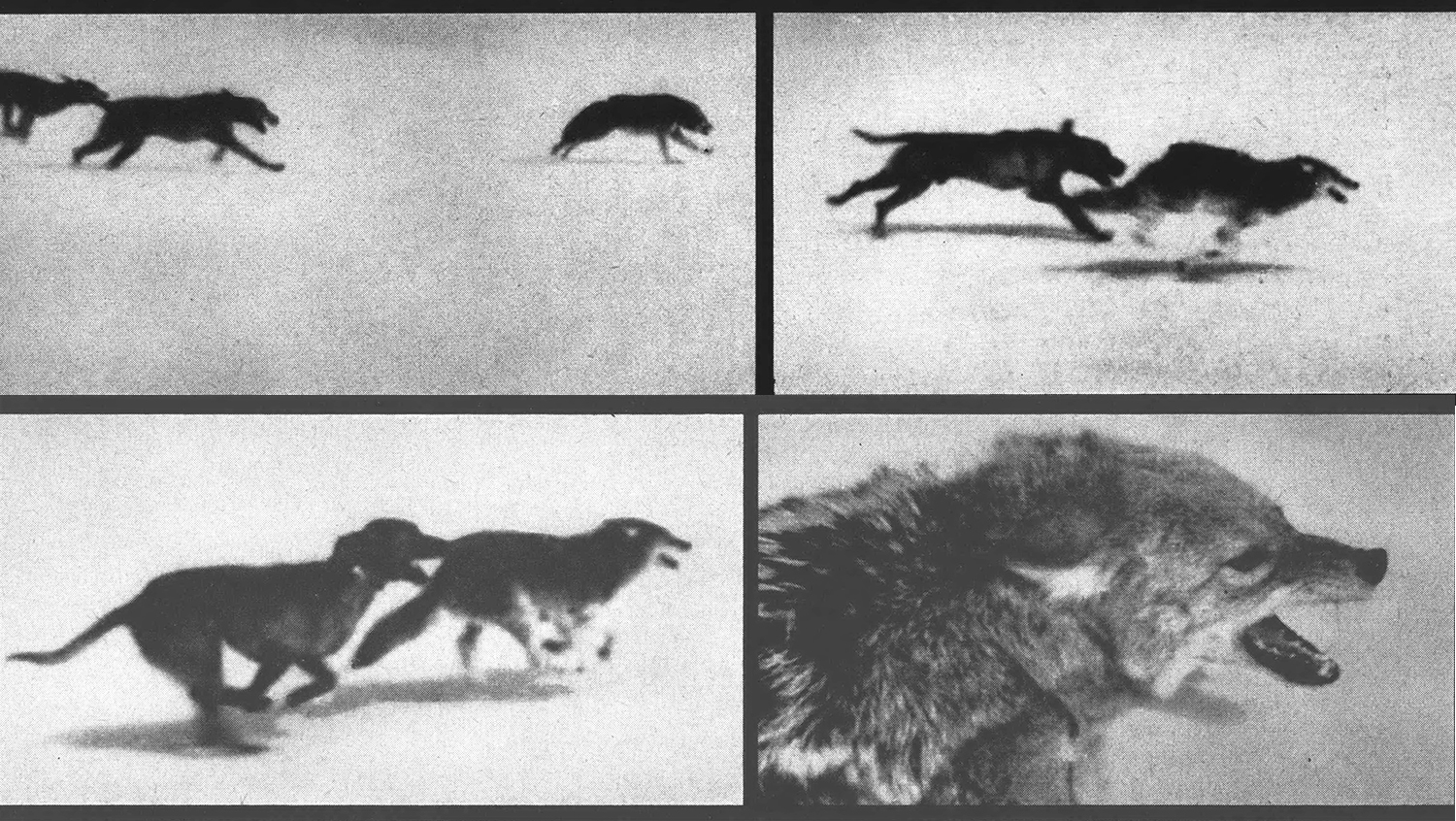 We followed them a long time. The coyote lined out through swamps and rough country, running like a greyhound. The bawling of the dogs faded out almost as soon as they took the track, and that was the last we heard of them. We just walked, mile after mile. Wet snow started to pelt down, and we lost all sense of direction. Finally, we came over a ridge and saw Ring, Bruiser, and Machine Gun trotting back on the track to meet us. We knew what that meant. Somewhere up ahead they had killed the coyote.