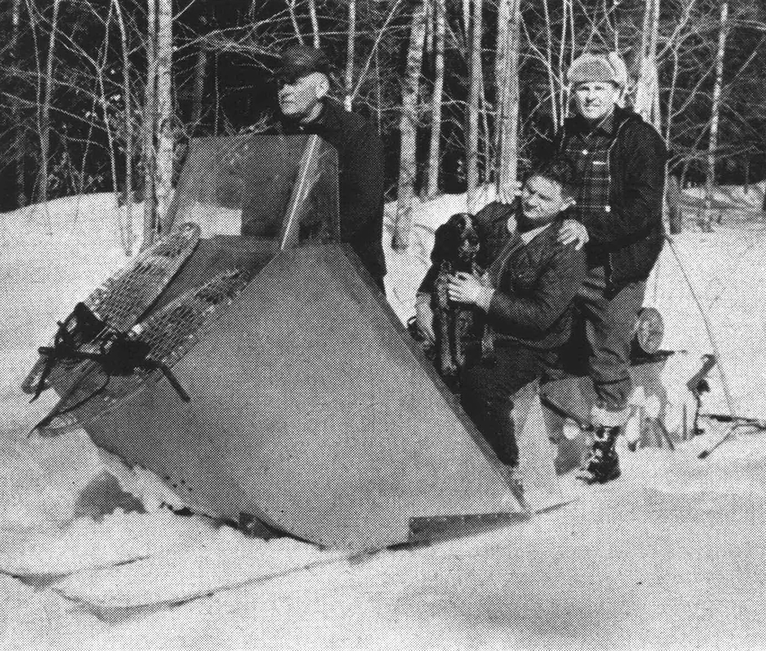 The sleds we use are ideal vehicles for winter woods travel. Powered with a 9 1/2-horsepower air-cooled engine and capable of making close to 35 miles an hour, they’re mounted on a pair of ski-like runners in front for steering and two fixed runners at the rear. The drive belt is a caterpillar-tread device of heavy rubber with steel cleats, floating between the rear runners and loose at the back end, so it can chew its way down into the snow to firm footing. Powerful enough to carry two or three men, the sled can be driven anywhere the timber will let it through. Vincent and I own one between us, in addition to Ham’s, and they’ve saved us many miles of snowshoeing.