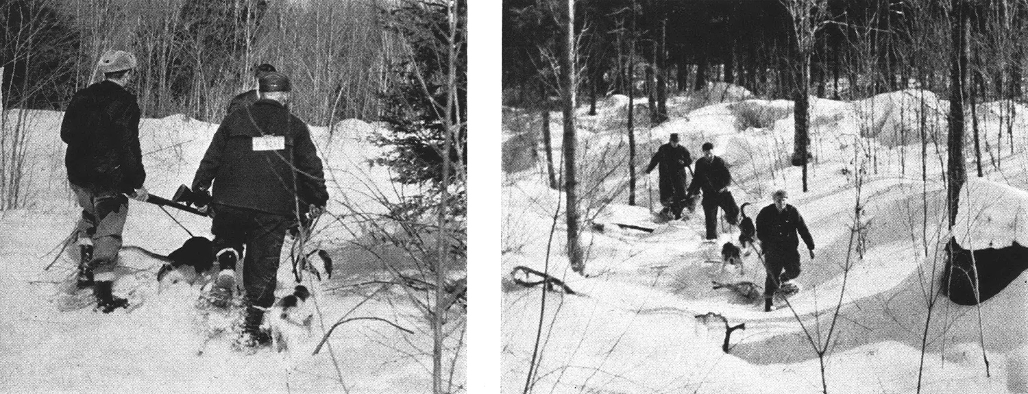 Success calls for three things: an abundance of quarry, good dogs, and the ability to follow them. Luckily we have all three. We hunt a big triangle, stretching 75 miles from Lake Michigan on the west to Lake Huron on the east, and 35 miles north and south, from Wolverine to the Straits of Mackinac. It’s timbered country, cut over in the logging days, and has big lakes, streams, swamps, and hills. Coyotes are plentiful. Roy and I have taken 15 to 18 a winter for the past 15 years. None have come easy, but they’ve all been worth it. We collect the Michigan bounty of $15 for males, $20 for females, but taking into account the cost of acquiring and keeping our dogs, veterinary fees, and all, we invest a lot more than that in every one we kill.