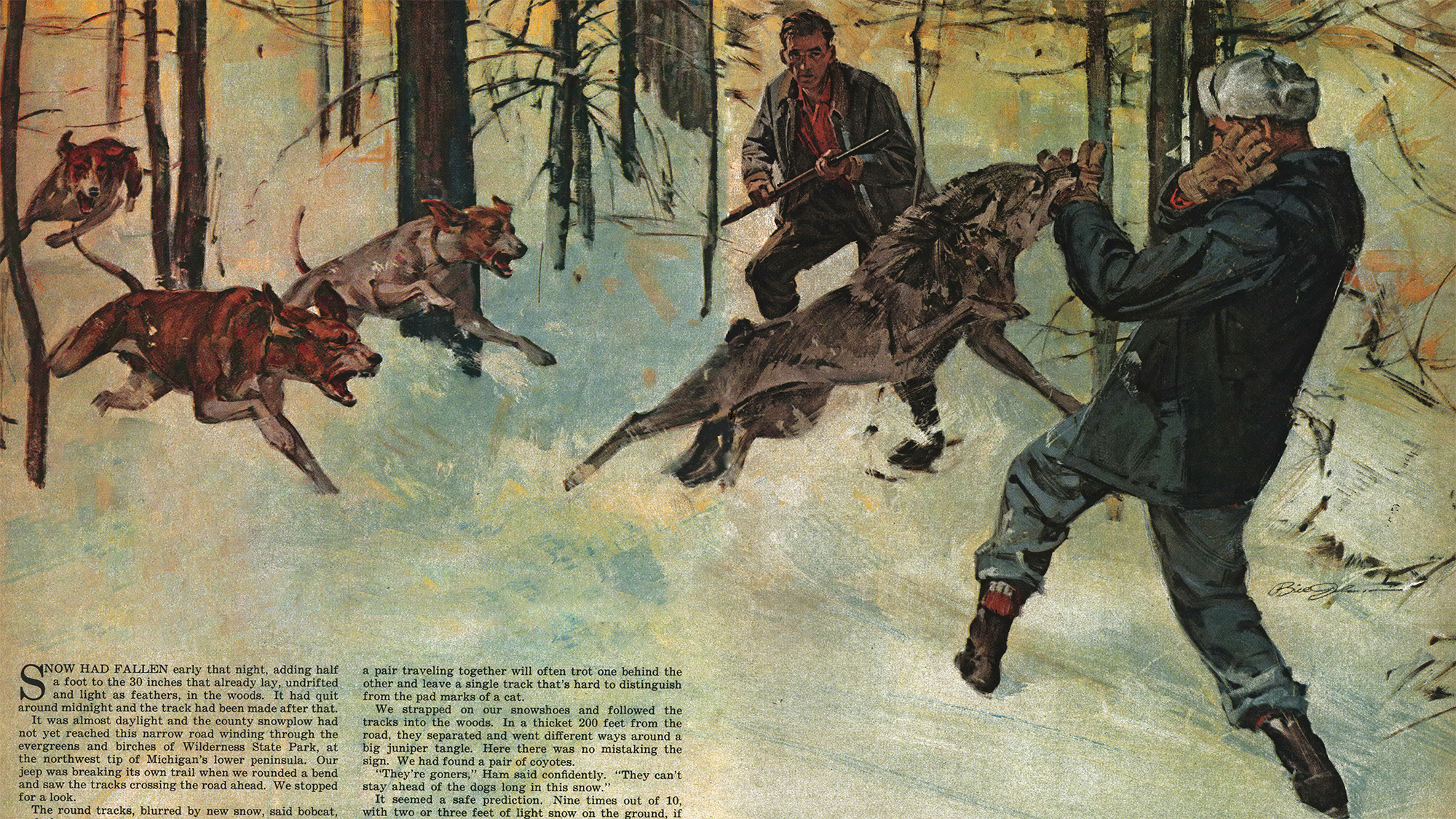 WHEN I FIRST moved to Indian River, the backroads were not snowplowed and we didn’t have a snow sled. Hunting in those days consisted of putting on snowshoes and taking to the woods with three or four dogs on leash, walking until we found a track and releasing our best cold-nosed hound. Then we followed him until the coyote was jumped, turned the rest loose, and kept going. Many days we walked 25 or 30 miles, many times we wound up at dark two townships away from our car, completely worn out and aching in every muscle.
