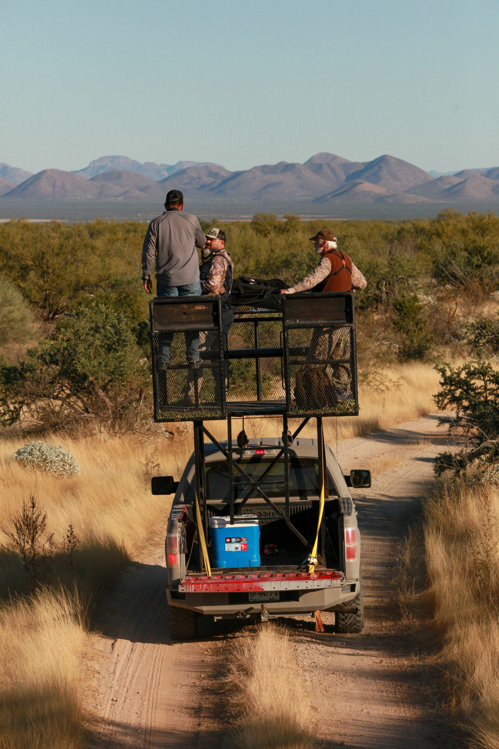 Neither did I expect to be hunting with an entourage. Opposite Kobe in a corner of the high rack, Hector German Arce sat stoically. In his hand he held a radio that he used to communicate in Spanish with our driver, a swarthy Sonoran named Luís. When we wanted a closer look at something, Hector radioed Luís, who stopped the truck, sometimes backing up to get a better look at what appeared to be a deer’s ear in the brush, or maybe the glint of an antler.