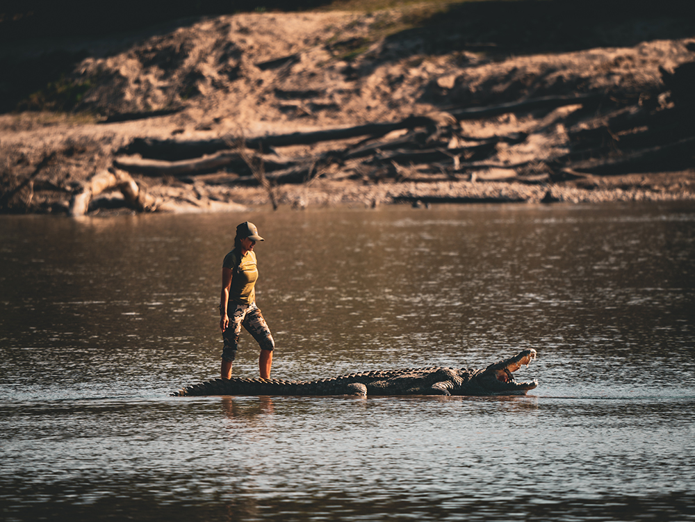 The top of a crocodile’s head, back, and tail are rock hard, like a thick turtle shell. This armor is not only protective, but it also absorbs heat when they are out sunning themselves. The rest of the skin, from about mid-body down, loses its rigidity. It turns into a tough leathery hide with big scales, but to the touch it’s almost like smooth, wet rubber. A croc’s legs are short but muscular, with five webbed toes and long claws. The head is long, wide, and very flat. This positions their eyes, ears, and nostrils above the water while submerging their body, which allows them to hunt while staying extremely hidden. The jaw is packed with teeth that continuously regrow and replace themselves over a croc’s lifetime The head and teeth are probably what most people fear the most, but for me it’s the tail—It’s pure muscle, and the source of all their power.