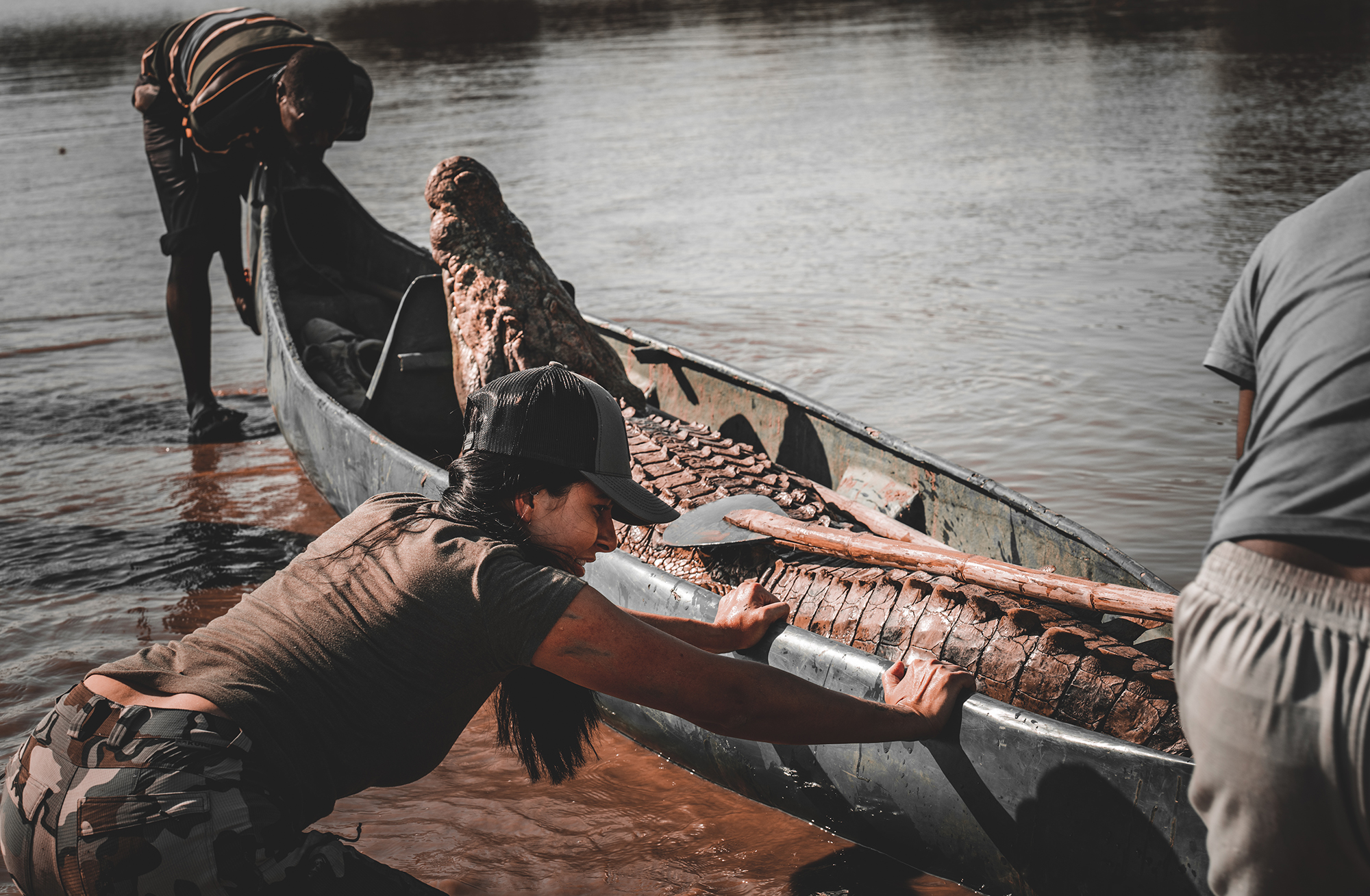 Thor, one of the trackers, and I were the first to canoe out to the sandbar. As I walked up to the crocodile through ankle-deep water, I was in awe. He was an absolutely amazing animal. The crocodile looked like he didn’t even belong on this planet, though his kind had been living here for millions of years. I was overcome, grateful for the opportunity to see and touch such an impressive creature in person.
