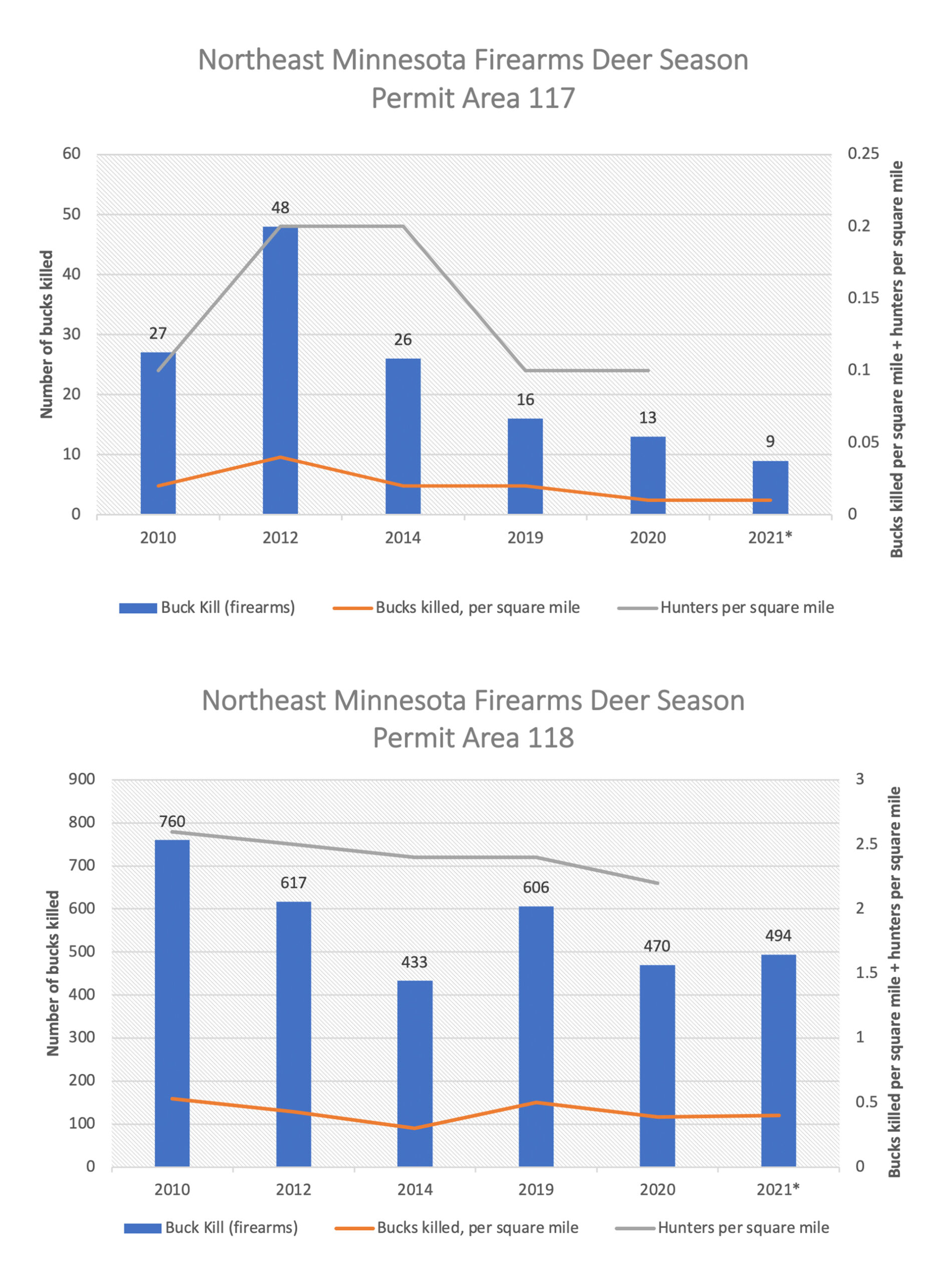 Minnesota DNR data show hunter densities fell 38 percent across the region (areas 117, 118, 126, 130, and 131) the past decade. Densities in 2010 averaged 1.8 hunters per square mile, ranging from one hunter every 10 square miles in Area 117 on Ontario’s border to 3.4 hunters psm in Area 130. By 2020 the region’s average was 1.3 hunters psm, with a high of 2.2 in Area 118.
