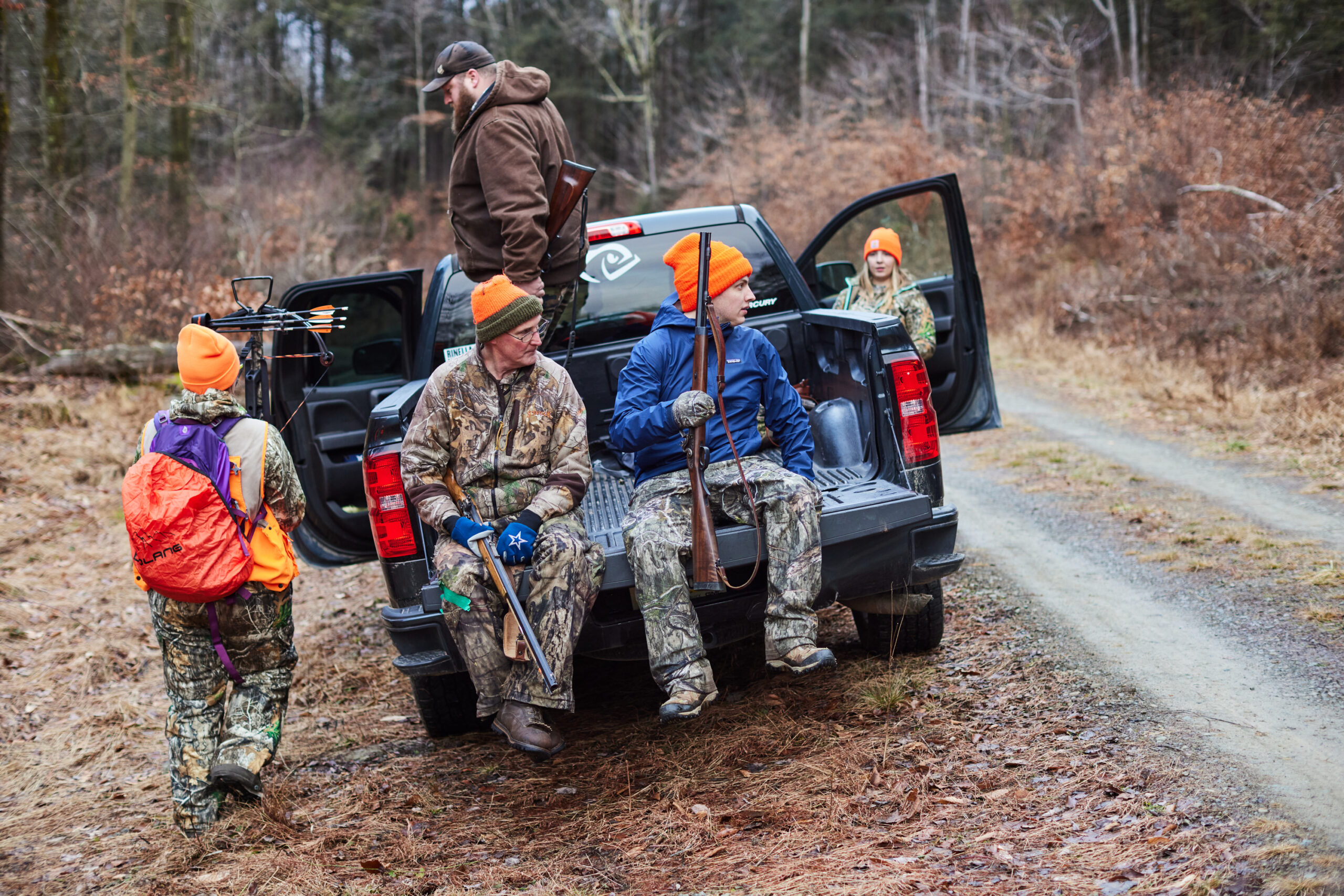 This A-frame cabin, which serves as a hunting camp for some 30 members, has stood in Sullivan County for nearly fifty years. The founding members bought the property nearly 50 years ago, burning the previous building to make room for their dream cabin. Henry HungThis bragging board runs the length of the camp’s dining room table and is a testament to the number and caliber of deer that live on the state game lands around the camp. Henry HungBlockers (or watchers, as they’re called in this part of Pennsylvania) head out to take their positions for the first drive. A quarter-mile push through a ridge of mountain laurel and thick pines produced eight does — all of which outsmarted our setup or flushed just out of range of our flintlocks. Blaze orange is not required for the flintlock season, though many hunters choose to wear an orange hat or vest. Henry HungThe author (left) and Brayden March comparing a modern Traditions PA Pellet Accelerator flintlock to an old custom-made long gun. March’s grandfather gave the gun to his grandson when he turned 12—the minimum hunting age in Pennsylvania. Henry HungAlthough it’s custom-made, March’s flintlock operates just like everyone else’s. To load it: Pour the desired amount of FFg powder down the barrel (most hunters use anywhere from 65 to 100 grains). Using the ramrod, push the patch-covered round ball down the barrel until it has compacted the FFg powder and can’t go any farther. (Some hunters notch their ramrod to take the guesswork out of properly seating the projectile.) Next, pull the hammer (left) back into the half-cocked position. Fill the flash pan (center) with fine-grain FFFFg black powder. Cover the flash pan with the frizzen (right) and thumb back the hammer into the fully cocked position. The flintlock is now ready to fire. Once the trigger is pulled, the hammer springs the flint forward into the frizzen, creating a spark that ignites the flash-pan powder, which burns through a touch hole and ignites the powder inside the barrel, propelling the round ball out of the barrel. Henry HungOne of the founding members of this deer camp, Steve Waldman of Montoursville has been flintlock hunting for 45 years. In all of those years, Waldman has successfully harvested just two deer with his flintlock. The low success rate doesn’t deter him from loading his flintlock each season because, as he says, “It’s just too much fun.” Henry HungMadalynn Talerico, 26, pauses while pushing the woods, on alert for deer that might cut back through the drivers. Although she’s hunted with a bow and modern rifle for years, she relished the excitement — and challenges — of her first flintlock season. “The flash pan powder had gotten moisture in it from the air, so the gun didn’t even go off on the only deer I tried to take a shot at this year.” Talerico says. “That was pretty disappointing, but also lit a fire in me to try to avoid small mistakes like that in future seasons.” Henry HungLoading the trucks to return to camp for hot dinner and cold beers. A day full of drives produced 25 deer, all of which flushed beyond the effective range of our flintlocks. Instead of sour moods over the lack of punched tags,hunters were in high spirits about the deer we did see, and what tomorrow would bring. Henry HungEnding our first day with a game of Setback in the living room at camp. With a good bit of strategy and a little luck, I was able to win a few rounds before heading to bed. Henry HungWaldman, 64, stretches on a foam roller during breakfast to avoid injuring himself in the woods. Predictably, jokes began to fly. “Make sure to stretch your shoulders, too!” hunter Zac Clark had shouted, bellowing as if Waldman’s hearing might be going, too. “I’ve been stretching before each hunt for the better part of a decade,” Waldman says. “I’ve heard it all.” Henry HungA watcher waits on an old logging road for deer to be driven to him. As drivers made their way up the ridge, a shot rang out close by. A lucky hunter — not from our group — had been sitting in the right place at the right time when one of the deer we pushed squirted out the side of our drive and into his lap. State Game Lands 134, which consists of some 8,000 acres in north-central Pennsylvania, is known for its abundant deer population and steep ridges thick with mountain laurel and pine. With most major logging projects occurring over 70-years ago, these old-growth canopies create the illusion of deep backcountry even if you’re just a few hundred yards off of the access road. Here, the PGC has created habitat management areas by clear-cutting small plots among the old growth to create thick cover for deer, upland birds, and small game. Henry HungPlanning the second drive of the day. Planning a deer drives through the big woods is easier said than done. Sometimes, battling the mountain laurel is the easy part, as the planning can take anywhere from 15 minutes to an hour. With multiple “captains,” each with their own idea on how to push the next ridge, choosing a plan became a democratic process that came down to gut feelings and, occasionally, votes. Some drives went perfectly to plan, while others fell short — a typical outcome for big group drives in the Northeast. Some hunters get overly emotional when a drive doesn’t come to fruition, and that’s why I continue to hunt with this laid-back group: tempers rarely flare. Henry HungAs snow begins to accumulate, watchers like March can more easily spot deer as they trot across the landscape. This drive seemed to have everything going for it—thick cover, plenty of sign, and lots of deer—but no shots were fired. Henry HungAfter finishing our final drive of the season, we unloaded our flintlocks. Our crew used the opportunity to test our accuracy and ensure that, if we had gotten an opportunity at a deer, we would have made it count. Clockwise, from top left: The author fires his .50-cal Tra