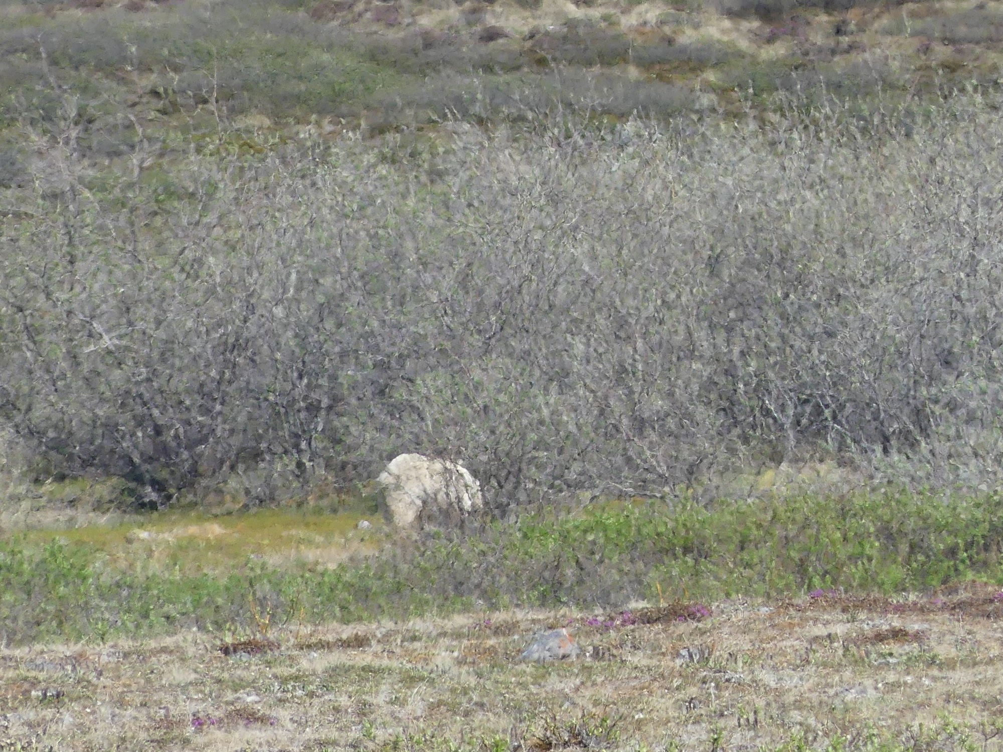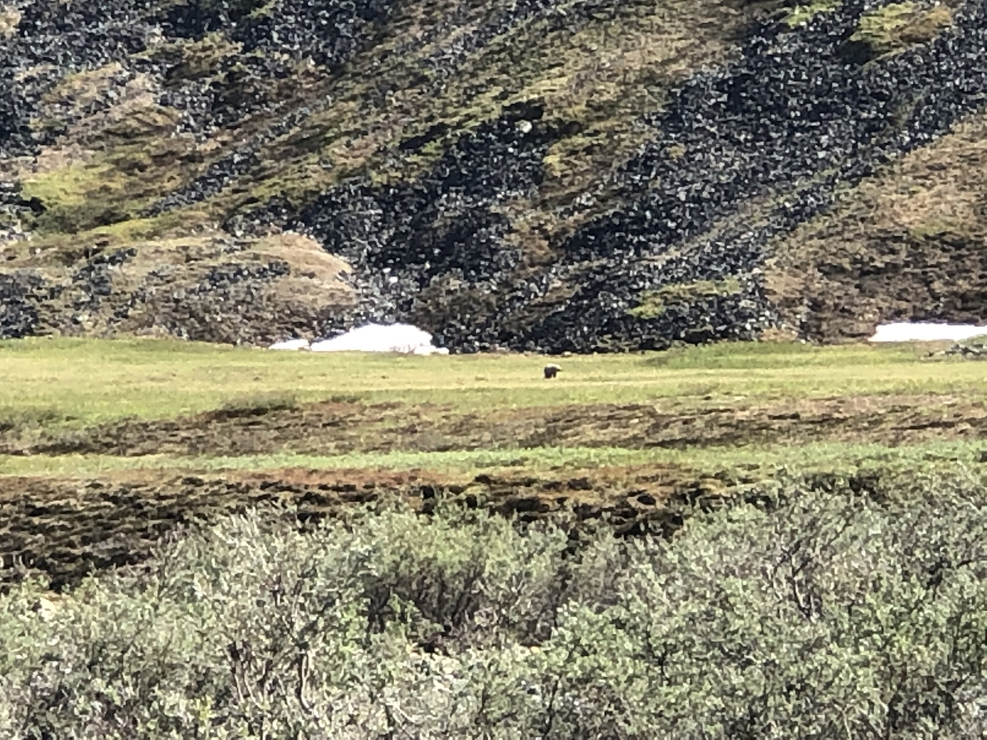 In June of 2019 Peter Flynn was on a 19-day trek across the Arctic National Wildlife Refuge (ANWR) when, 400 yards away, he and his companions saw a bear pouncing like a fox on ground squirrels. At first Peter thought it was a grizzly. When he examined it with binoculars, he wasn’t so sure. One of his companions took a picture of the bear with her iPhone. The distant photo shows what looks like a light-colored grizzly with an abnormally long neck. Peter and his companions wonder if the bear was a hybrid, the result of a polar bear and grizzly interbreeding.