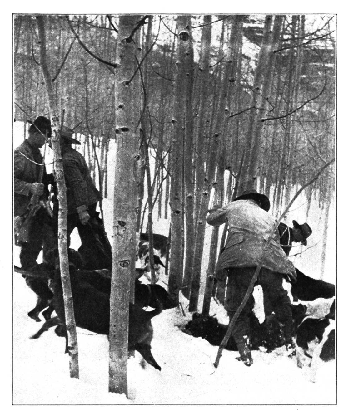 The snow was too deep to follow right down, so we followed along the ridge for about a mile. We stopped to listen and heard the dogs barking “bayed.” Then we lost no time in picking our way down through the thick quaking aspens. Down timber and snow, for about one and a half miles, breaking a trail single file for the horses. It was now 4 p. m., and they had been going since 7 o’clock that morning and were therefore tired. When we got down off the knoll we found the dogs were baying in a thick bunch of spruce. As we approached nearer we saw the old bear, treed in a big spruce, about thirty feet from the ground.
