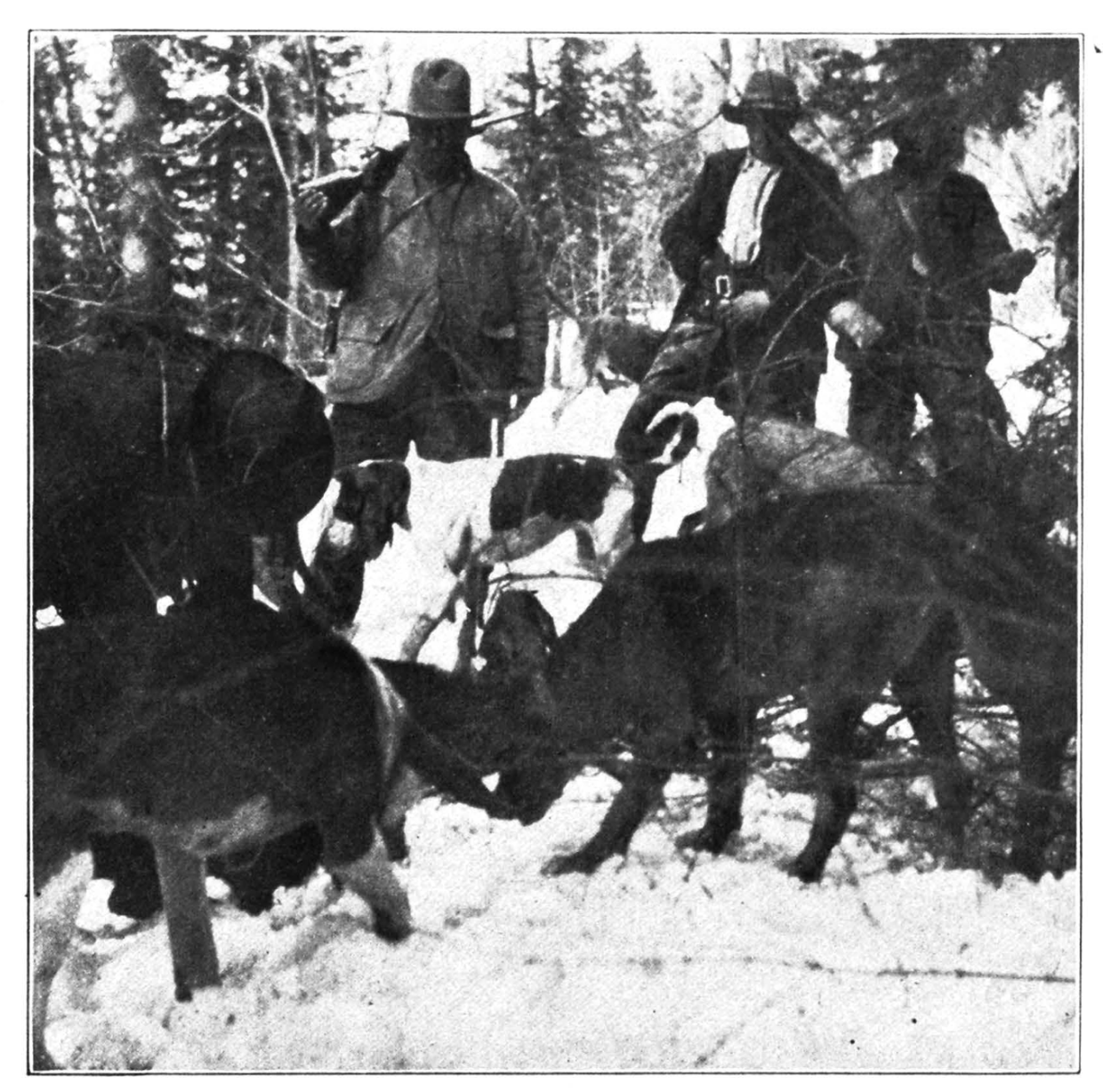 We rounded up the dogs again (the tracks being in dry ground and about three days old) and got them off in a bunch, tracking the bear right up to the edge of the snow. Where they entered the snow they were only about twelve hours old. We had held the dogs back for some time before reaching the snow, but now turned them loose again. They ran up into the tall spruce where the snow was four or five feet deep. We could plainly hear them tonguing, and occasionally got a glimpse of them when they ran out over a snowbank and no timber obscured the vision. Soon, however, their bell-like notes grew fainter and later could not be heard.