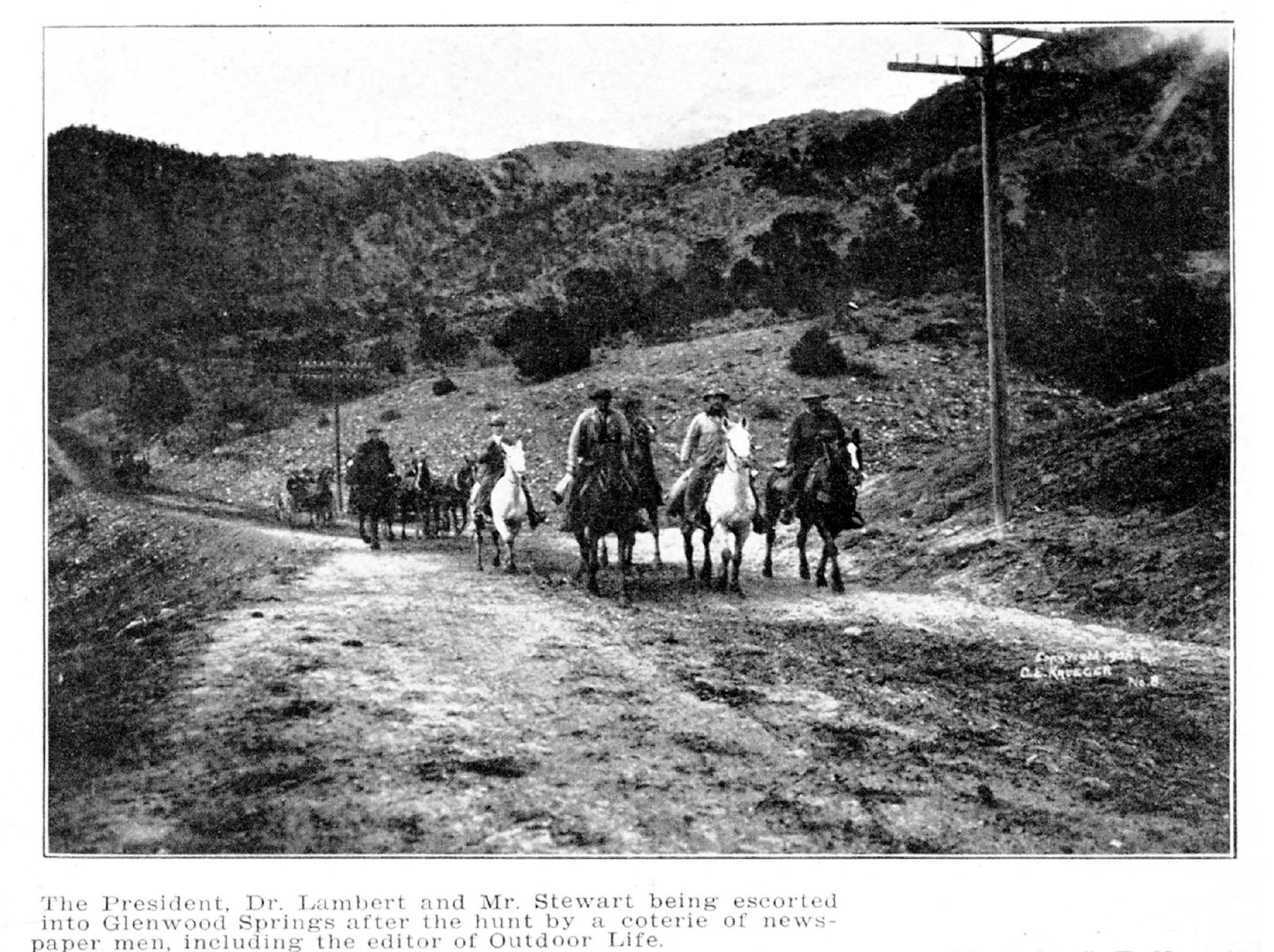 On May 6th we pulled camp and started for Glenwood Springs—the President, Mr. Stewart and Dr. Lambert going first by horseback and arriving in Glenwood Springs at 3 o’clock in the afternoon. We followed with the packs and dogs and got there about 3:30, where we found a royal reception awaiting the President and party.