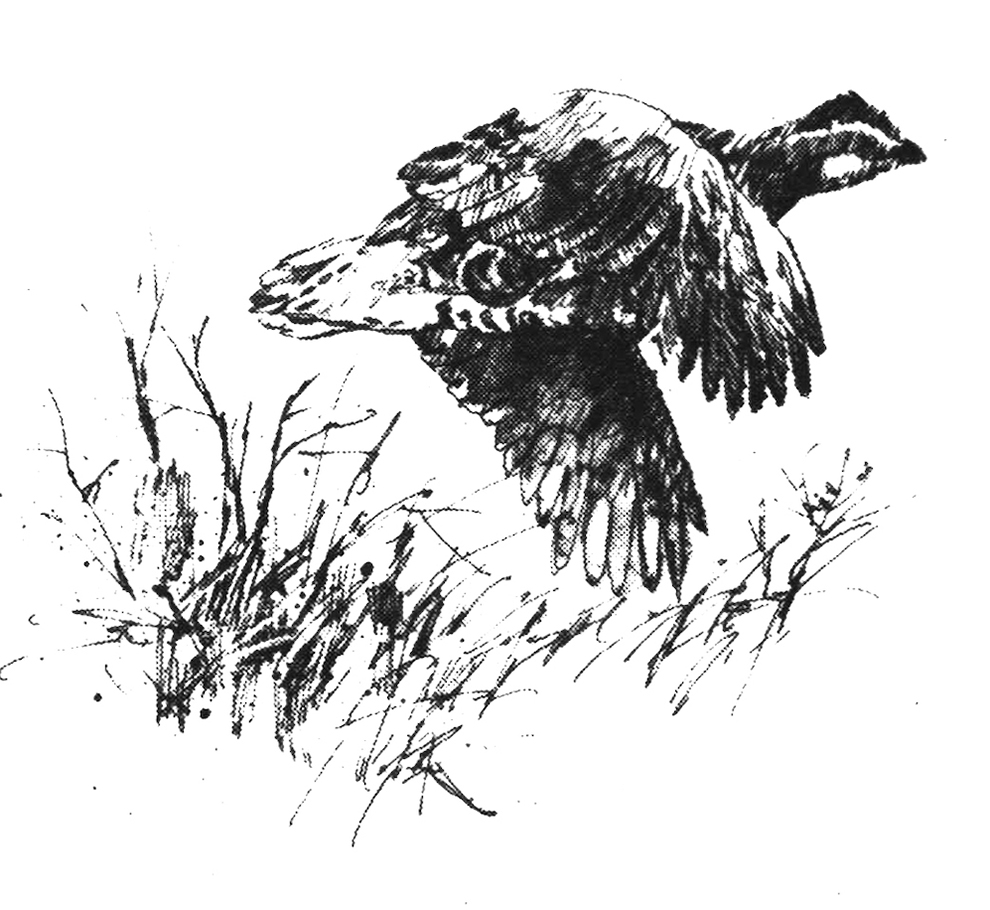 We had estimated on this occasion that the covey consisted of 16 to 18 birds, which is a little above average for our area. Three or four of them had swung into a weedy draw about 75 yards ahead of us. They had not been chased, and we thought we might shoot a couple more singles and still leave plenty of seed. Peterson elected to cross to the other side of this depression so we could keep better track of the dogs. I waited for a few minutes and then, when he was on the opposite side, the two of us started toward the area we thought held our quarry. We had covered about 50 yards when a bird jumped wild from some place ahead of us and doubled back toward me. I’m not the world’s greatest shot on incoming game, so I decided to wait and shoot when the bird was past. But something happened. The bird was flying through sparsely branched, rather stunted trees when it suddenly fluttered to the ground. It started to run, but one of the dogs dashed up, caught it, and brought it to me. Neither Tom nor I had shot; the quail had hit a twig and broken a wing. I have often marveled that grouse blasting out of thickets do not frequently fracture bones, but had never until then seen it happen.