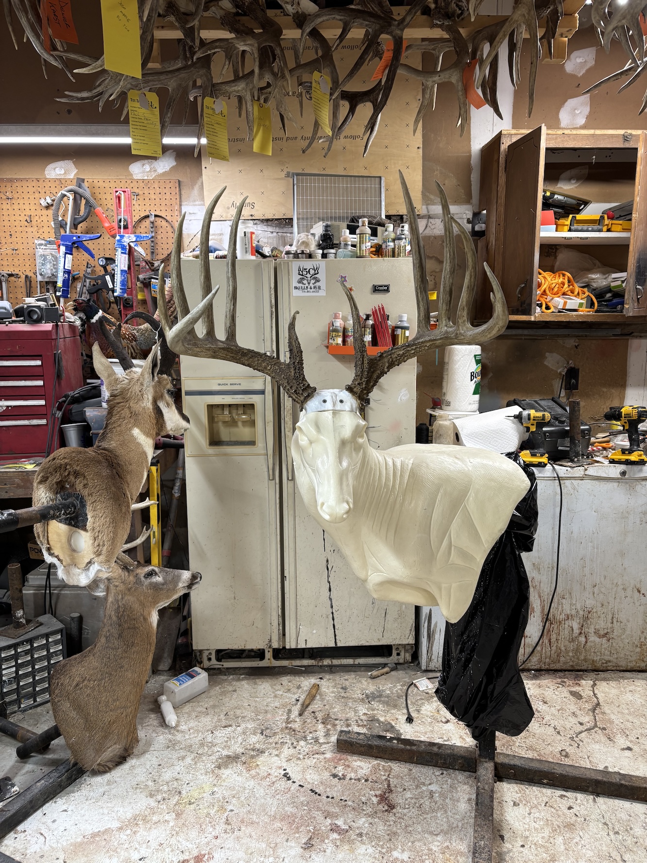 The replica antlers are with a Wichita taxidermist, who is using a cape from a buck Matthew shot with his bow this past October to recreate the original shoulder mount Albert Daniels sold decades ago.