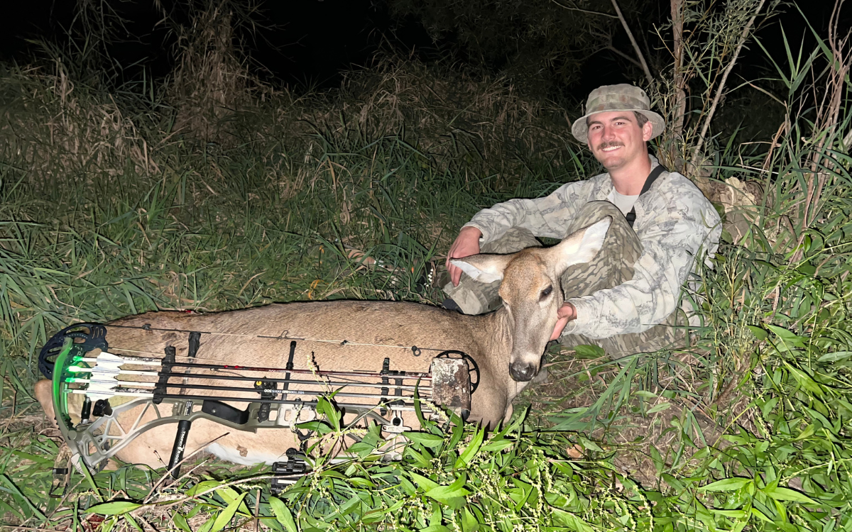 Once they got set up that evening, they saw a couple doe milling around in the bottom. As it started to get dark, they saw a nice buck stand up in the CRP about 100 yards away. He was bedded near a band of sparse cedars that ended right along a sea of canary grass.