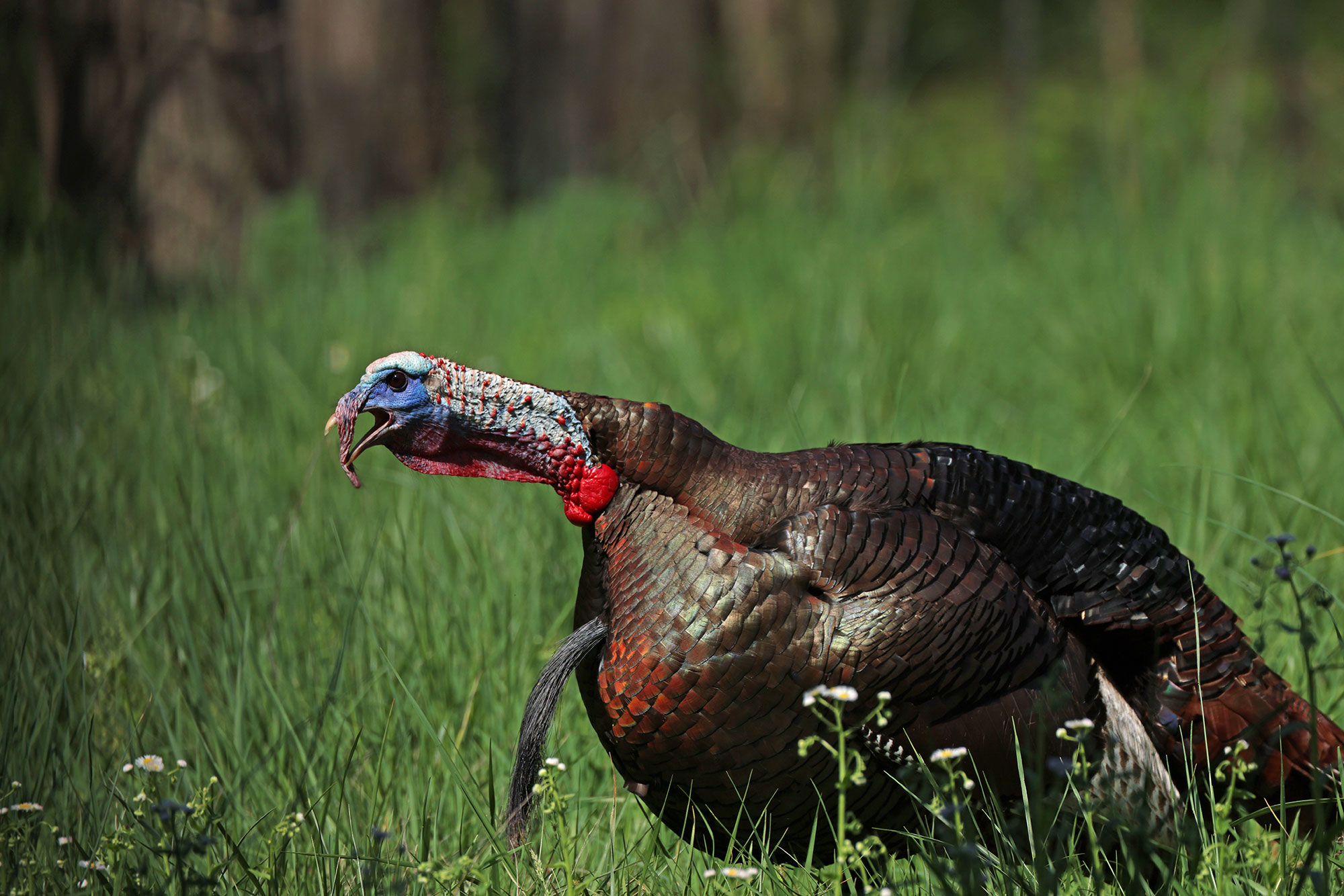 The wild turkey gobble is the flagship turkey sound. It’s commonly made by male turkeys (longbeards and jakes). However, hens can gobble, too. This vocalization is a long-range call that announces the presence of the turkey that sounds it out. It’s used to challenge other birds, give hens their location, and more. Likely translation: “I’m right here. Come and get me!”