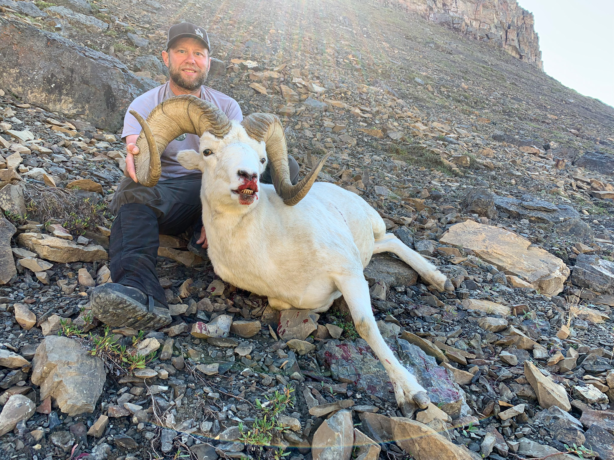 A zipper broke the silence of opening morning. The first day of sheep season always brings an urgency to get the tent open and glass. Immediately we spotted a single ram, only about 800 yards away on the mountain above our tent. With the spotting scope peeking through the tent’s narrow opening, we saw that the ram was 8 years old and barely full-curl on one horn. He was legal, but only just, and appeared to be alone.