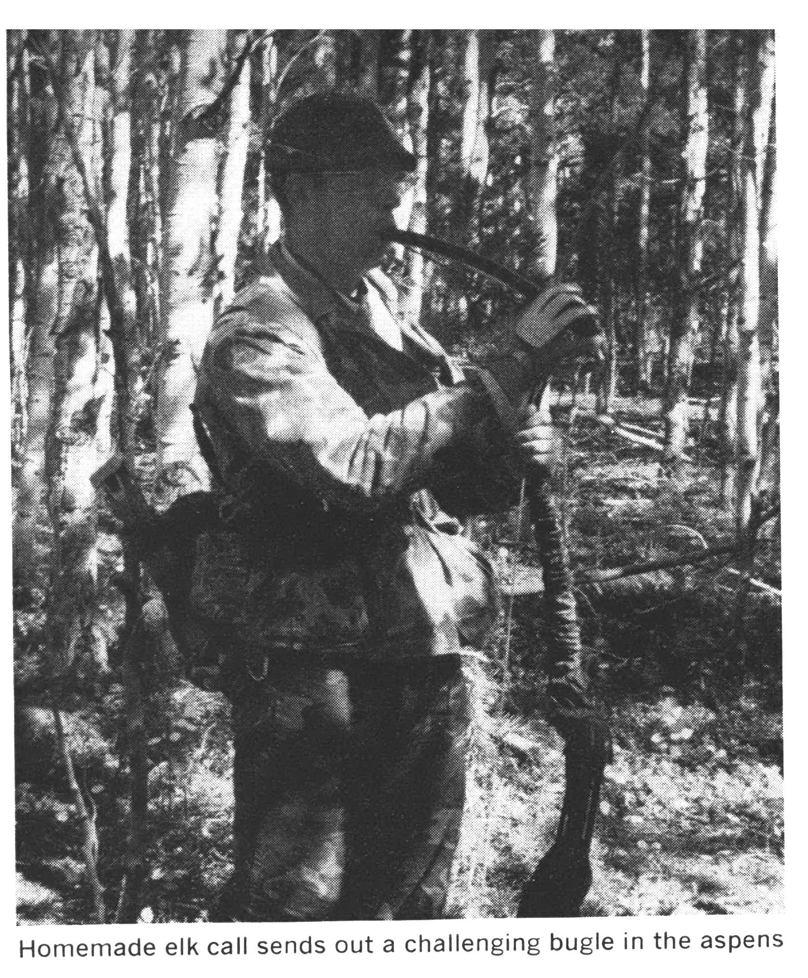 I sneaked around downed timber and studied the forest for hours with my 7 x 35 Bausch & Lomb binoculars but saw no game, and I couldn’t find any fresh sign. I became convinced that no game had used the basin for weeks. As a last resort I tried bugling with my homemade elk call. There was no answer. I concluded that my best bet was to walk over a ridge and head down into another basin in a nearby area.