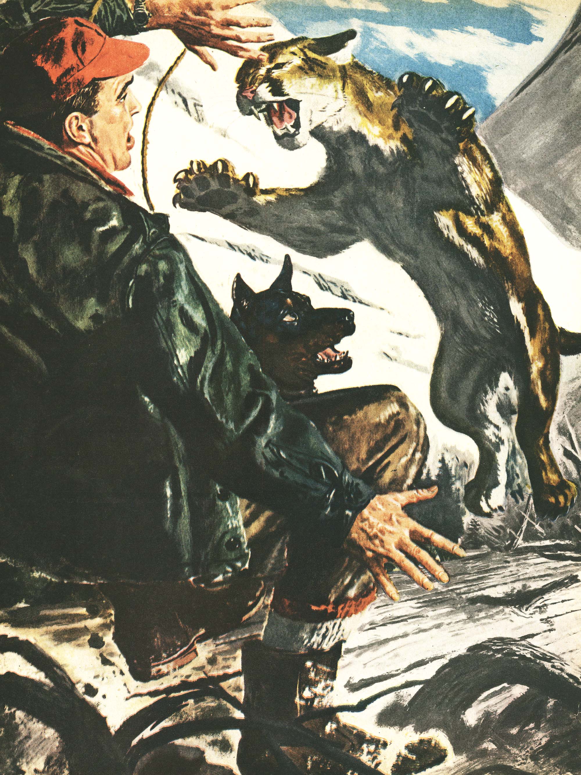 Charlie caught and tied Prince. After leaning the rifle against a stump, I slipped out of the packsack I always cany on such hunts and fumbled past the first-aid kit, emergency rations, candles, matches, extra shells, and other gear to get my dog ropes. I fished them out and started for Lu and Jim. I could have caught Lu without any trouble, but not Jim. He saw me coming and, cantankerous and stubborn as always, evaded me by jumping down the bank. I called him back but he paid no attention. He was directly under the cougar now, baying and fretting, and he liked it down there.