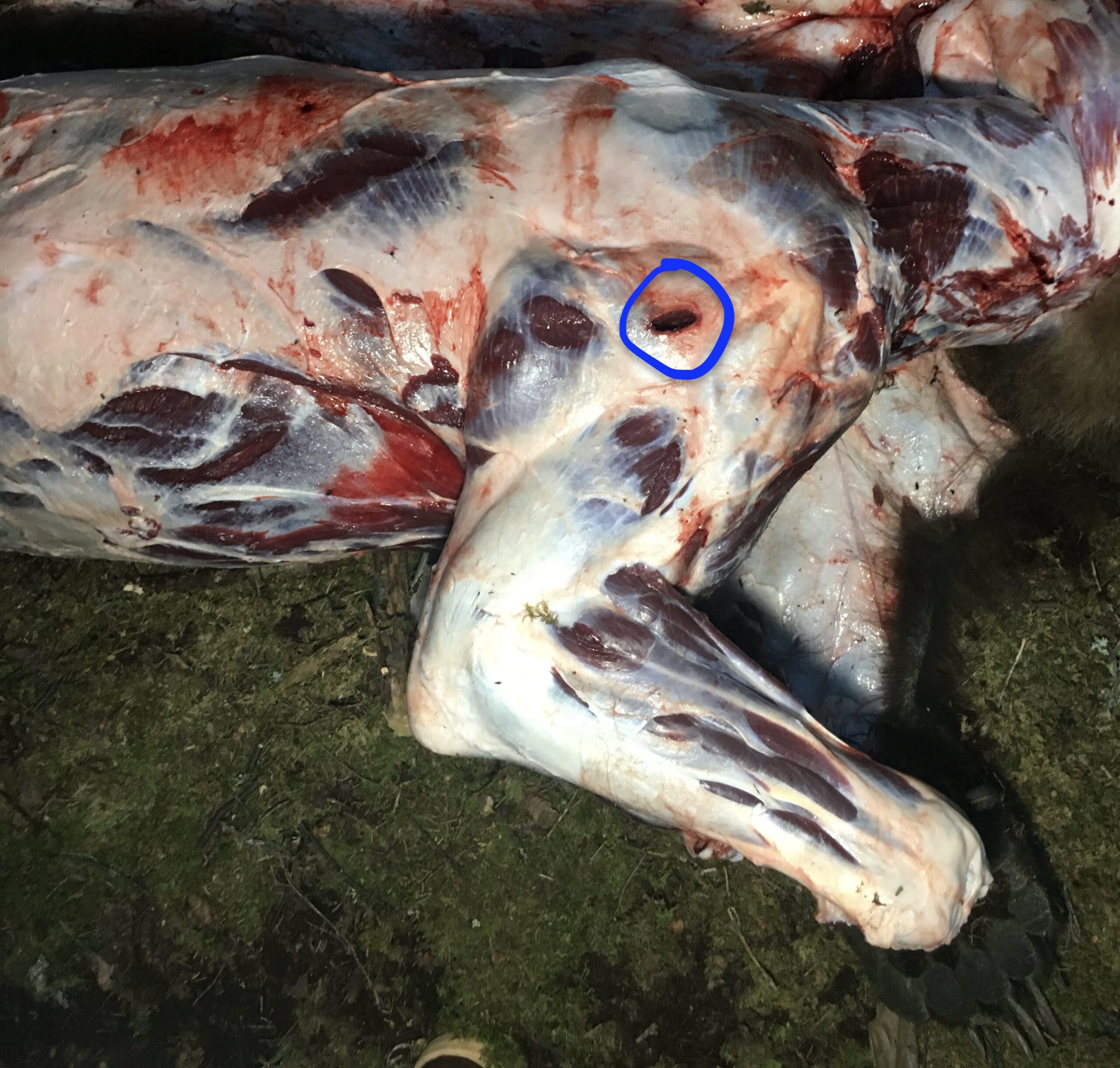 For as straightforward as understanding black bear anatomy should be, even many of the hunter education diagrams get it wrong. In the popular projector-slide overlay diagrams that International Bowhunter Education Program uses, the vitals of the bear are shown slightly farther forward than they are in real life. One of the most accurate references that I’ve found is a widely-shared photo attributed to Woody Sanford of a necropsied black bear that’s frozen and propped up to show where the vitals actually are. This image has been posted on various forums and websites for nearly 20 years. Although its front leg is slightly back, it gives a good picture of where the heart and lungs sit.