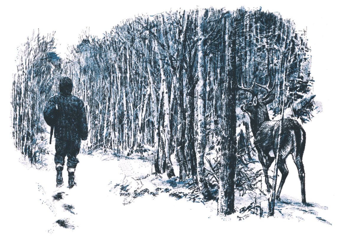 Expect the unexpected. Keep your eyes open, your ears cocked. When you stop, don’t just stand. Look and listen, hard. If there’s a wind blowing in puffs, move when it blows, listen when it dies away. And remember that the less commotion you make, the greater the odds in your favor. A walk in the woods for exercise is one thing, a deer hunt is another. The most stupid whitetail you’ll ever meet (and you won’t meet many) can get the best of you if you’re not doing your part.