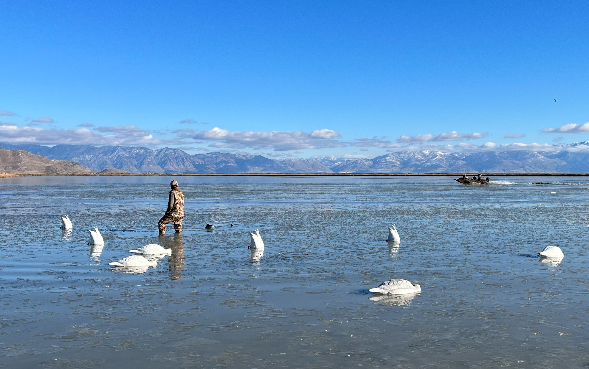 Turns out, the stoke from my first sit hadn’t prepared me for the excitement of the next hunt. To beat the crowds, we went where not many can follow: the now very shallow Great Salt Lake. It’s so shallow in fact, that you have to have an air boat to access some of the best hunting spots. Now, I’ve gone on one of those Florida alligator airboat tours before, but it was nothing like whizzing over inches of glassy water and reeds along the Wasatch Range.