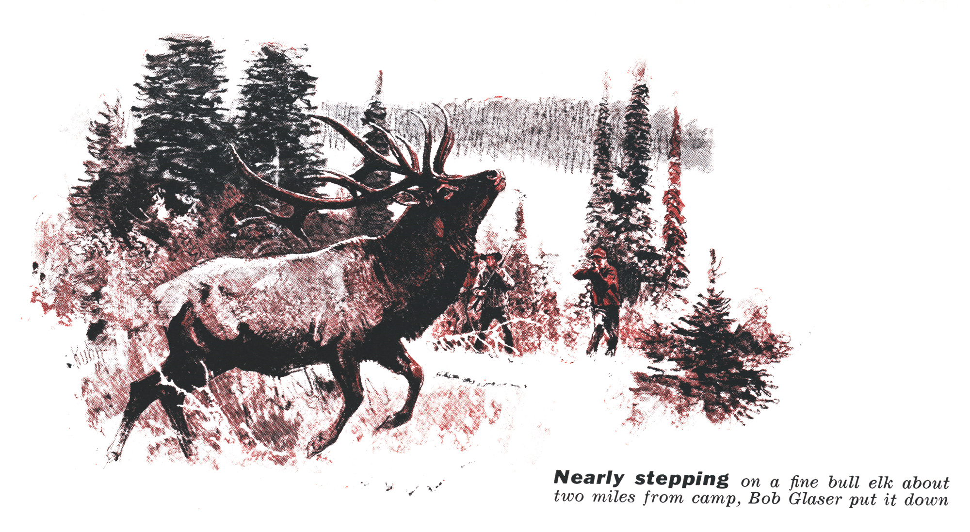 IN THE YEARS I have made my living as a wildlife artist I have done my share of hunting, and I can’t complain about my luck. I’ve made trips for big game to Alaska, Newfoundland, New Brunswick, British Columbia, Montana, Maine, Kenya, and Tanganyika, and I’ve taken some fair heads and skins. The list includes whitetail and mule deer, pronghorn antelope, goat, moose, caribou, black and grizzly bear, various African antelope, zebra, and a Cape buffalo. But there was one gap that I had long wanted to fill. No elk head hung in my trophy room.