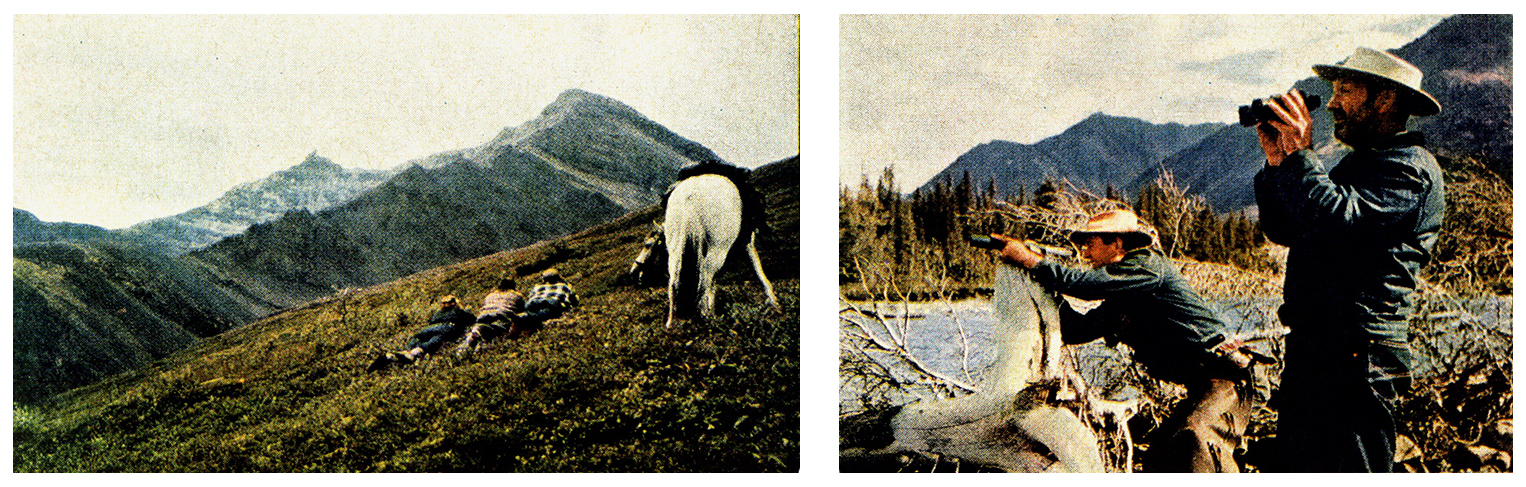 The second day, we carried the spotting scope, set it up in a rocky creek bed, and picked out a ram close under the rim of a tremendous ridge flanking the valley. We tied our horses in a willow clump, packed guns, glasses, scope, lunch, and cameras, and started the climb. The route we chose ran along the crest of a steep ridge, and after five hours we were close enough to peep through a crack in the mountain wall. Now we could see two good heads instead of just the one we’d first seen. One ram was lying down, his rump toward the cold wind blowing up the mountain. The other, 200 yards to the left, was standing, staring suspiciously in our direction.