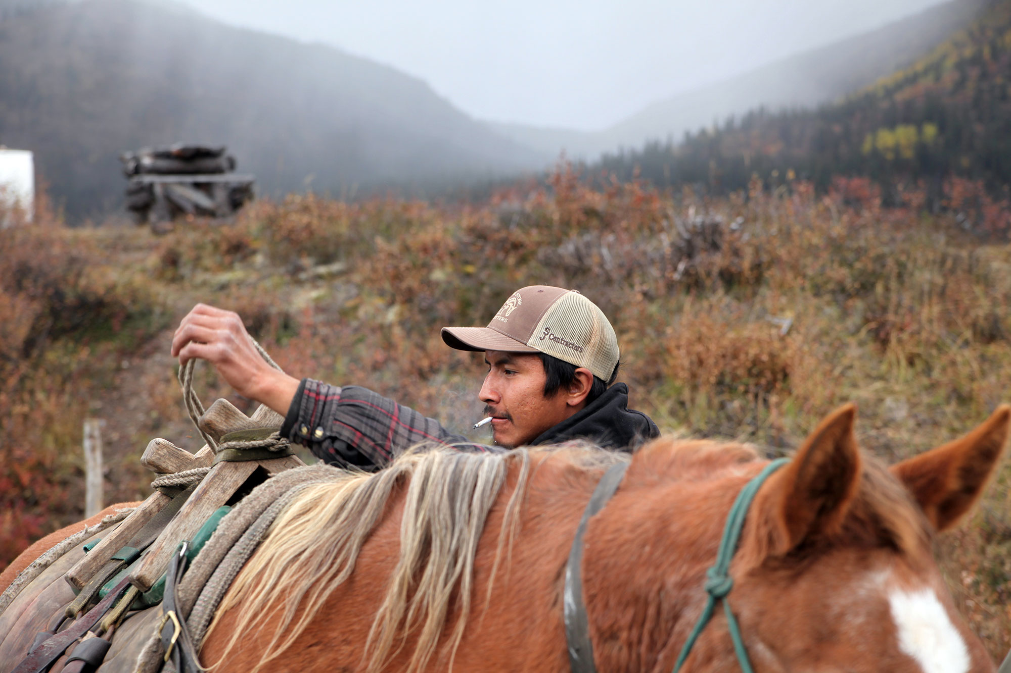 Then there’s LaDue, a hand-rolled smoke punctuating his mischievous smile. At 26, he’s a veteran of Deuling Stone. He started packing here at age 16, himself the apprentice of his cousin, Otto. Otto taught LaDue the intricate art of packing, lashing hemp rope around canvas tarps to create a lattice of webbing sufficient to secure the panniers that are the boxcars of a pack train.