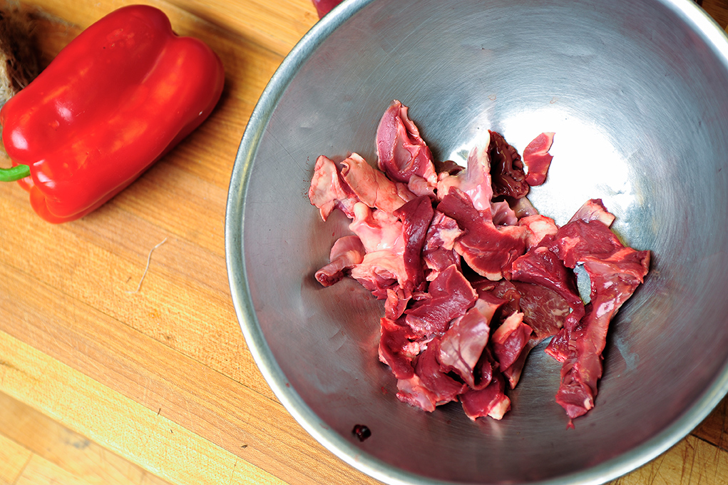 Small strips are ready for Venison Heart Bruschetta.