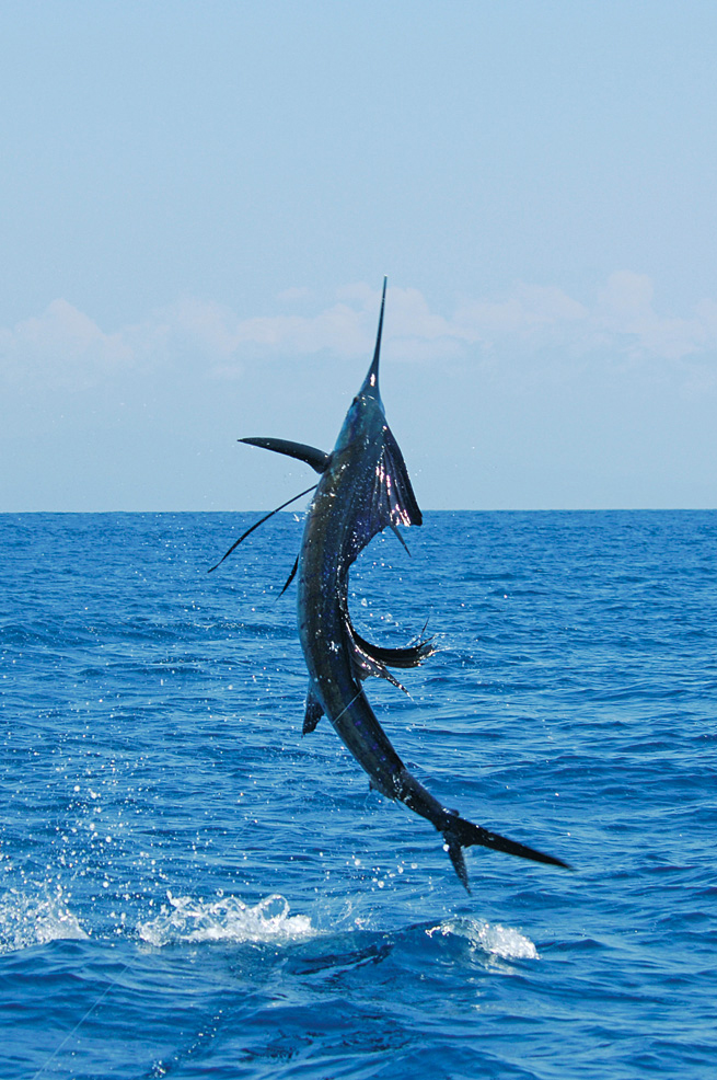 Black, white and striped marlin are all worthy adversaries for sure, but my vote for toughest of the marlin is the mighty blue. It is often coaxed by natural sewn baits or lures dragged via outriggers on 16- and 20-pound tackle, but to me, that's definitely on the light side. Blues in the 800-pound class and 1,000-pound blacks have been caught that way, but only because these fish are of open water, and the boat handlers and anglers were supremely skilled and aggressive. It's the 50-, 80- and 130-pound-class tackle that seems right to meet the challenge of the true monsters. Their rapier bill is no nose ornament, either–many of my guide friends sport puncture scars. Just last July a blue marlin estimated at 800 pounds flew across the width of a boat, impaling Bermudan mate Ian Card below his collarbone and taking him 15 feet below the surface as his father watched in horror. The 260-pound Card wrestled free, with a fist-size hole in his chest, and somehow managed to survive the ordeal. If a marlin in the air doesn't bring a shout of primal joy from you, there's something wrong with your wiring. Or perhaps it's just that your throat's dried up from fighting the beast. Jerry Gibbs