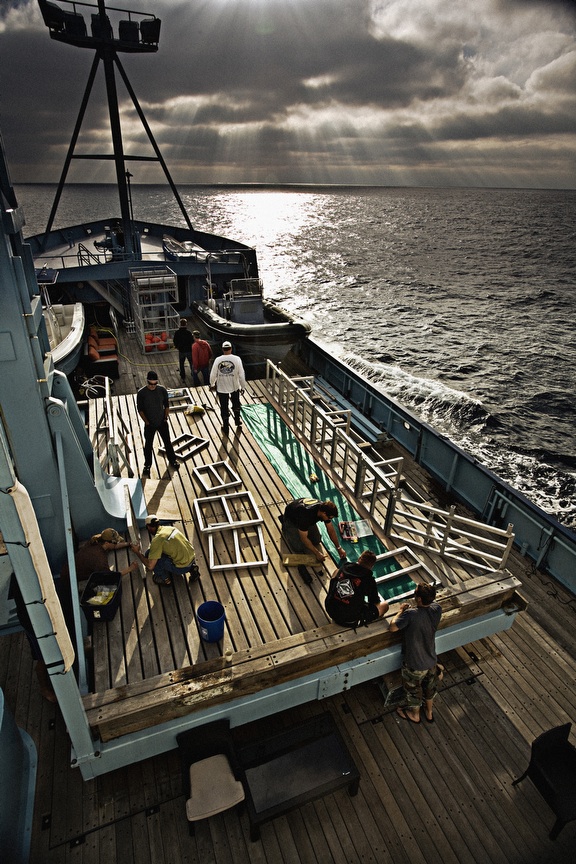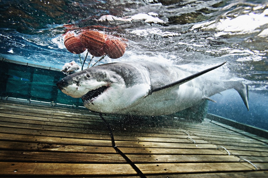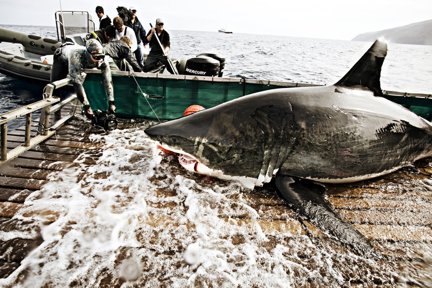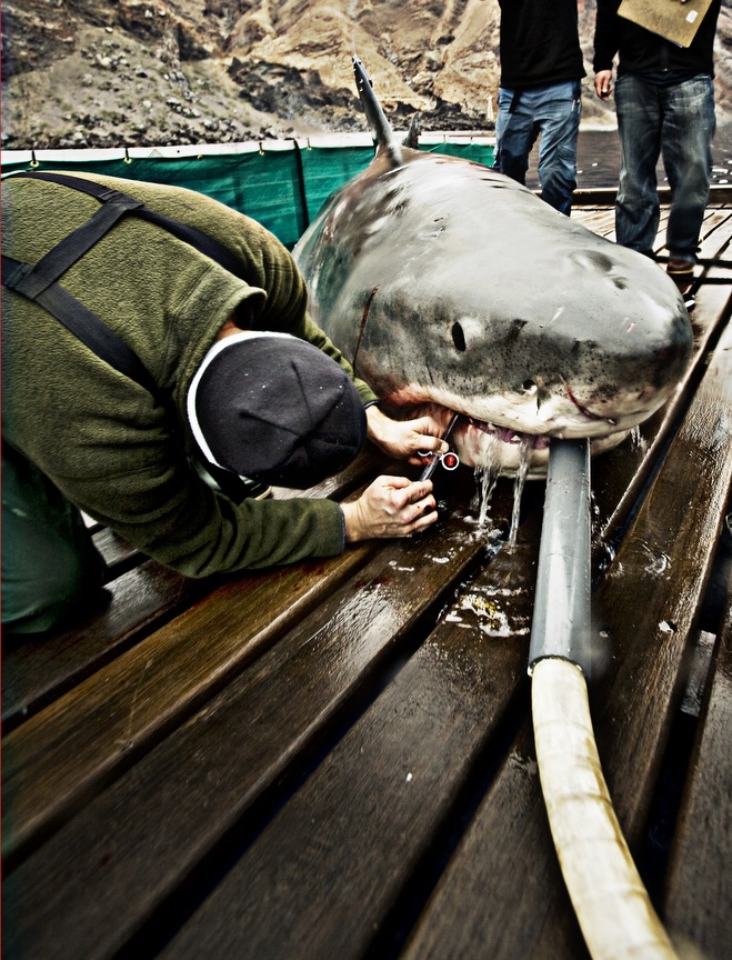Chris Fischer and marine scientist Dr. Michael Domeier lead a team of researchers off the coast of Baja, California. The crew uses rod-and-reel fishing techniques, modified to accommodate the hefty 4,000-pound great whites, to get the fish into the boat. The process is documented in Expedition Great White, which premiers on Monday, November 16th, at 9:00 pm on the National Geographic Channel. Check out the VIDEO PREVIEW HERE!Once caught, various tasks and tests are performed on the great whites. Tuna is the bait primarily used to catch the sharks. It takes all hands on deck to control the shark and, of course, keep it safe and healthy while out of the water. "We have to subdue the sharks so we can dictate where they go," Fischer says. "But at the same time, we have to handle them in a gentle way." Dr. Domeier was the first scientist ever to draw blood from a mature great white female. The blood is tested for hormone levels, which provide information about great white mating and birthing habits. It takes a special kind of scientist–and person–to boldly put your hands so close to a great white's jaws. Satellite tags are attached to the dorsal fins. The sharks' swimming patterns can be tracked for years if the tags stay attached. "Great white sharks are one of the most rewarding species I have ever worked with," Domeier says. A modified forklift is used to transfer the fish back into the ocean.