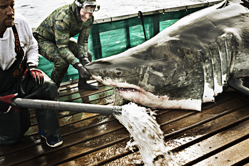 Researchers use catch-and-release techniques to study great white sharks.