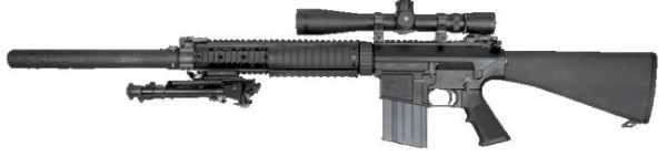 Designed by Eugene Stoner, the Stoner Rifle-25 is loosely based on his AR-10 prototype in its original 7.62×51mm NATO caliber, or its civilian commercial counterpart, the .308 Winchester cartridges. Tuned for precision as a “multi-target” sniper rifle, the SR-25’s barrels are housed within free-floated handguards. At 10.4 pounds (without magazine) and 39.5 inches long, the SR-25 is designed for hunting from a stand.