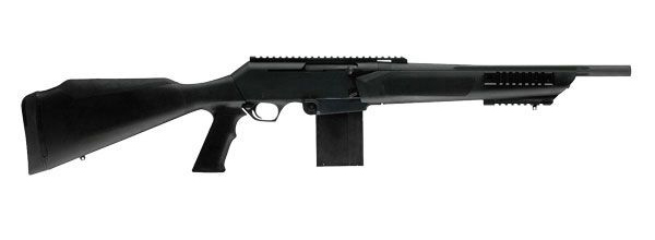 Provides heavy-hitting power at short to medium ranges in a handy carbine-sized package -- 7 pounds (without magazine, accessories), 31 inches overall length with collapsible stock -- that is ideal for tracking big game in dense woods and heavy brush. It operates at a relatively low pressure compared to standard ARs, so it is reliable, and it features a flat-topped upper receiver ready for a wide range of optics. —J.H.