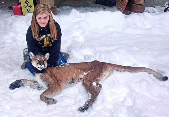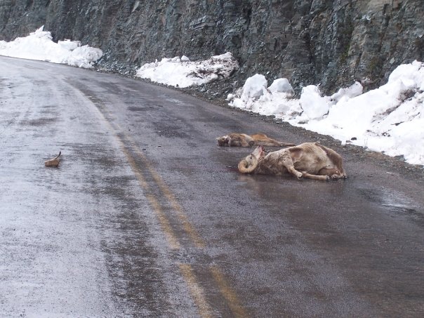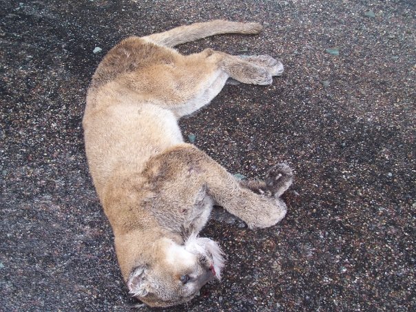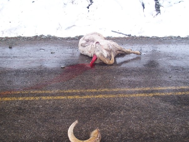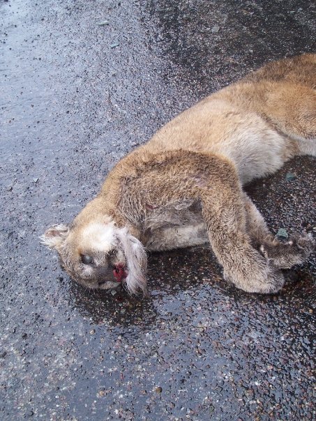 “My brother was visiting a friend in Montana and touring through Glacier National Park. They were hiking up a closed road when they came upon this scene. It is evident that the mountain lion and bighorn sheep were fighting on the mountain and fell to their immediate death sometime during the struggle. Pay special attention to the mouth of the mountain lion—it still has sheep hide in its mouth!!!!”
