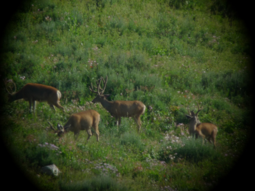 I was about 15 minutes behind schedule once I got to my chosen spot. Within 5 minutes I had a bachelor herd of three bulls located.... ah! It feels good to finally be here, not to mention actually finding elk on the first morning of scouting. Two small raghorns ( A 5x5 and a 6x6) and nice mature 5x5 with long beams...I found a great mule deer buck in the canyon as well. On my way back to the trailhead I spotted a bachelor herd of 5 mule deer feeding amongst the wildflowers out in the open. One really nice buck with them. After a practice stalk... (I made it to 45 yards from the good buck) I headed to another glassing point to view where I'd come from... I found a big bull moose after 10 minutes.... man Utah has game everywhere!!! I got back to the truck around 11:45 and took to the road...