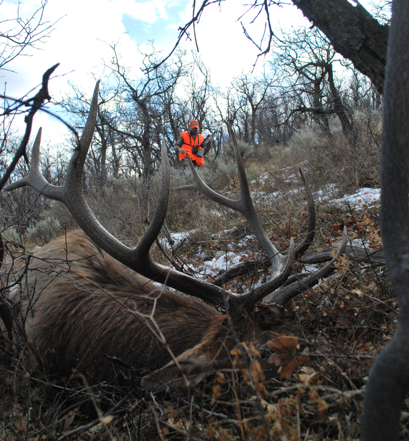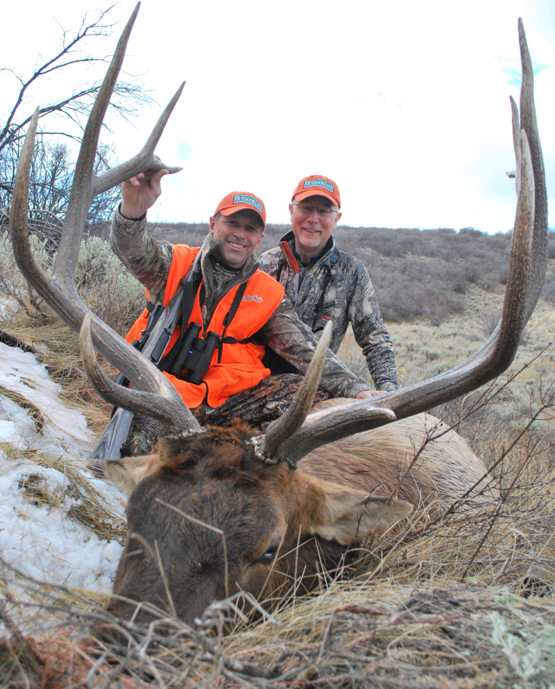 John and Todd take a moment to celebrate. John took this bull with a Mossberg 4X4 topped with a Zeiss Victory scope Remington 180-grain Bonded Core-Lokt bullets. His elk took 10 steps and toppled over.