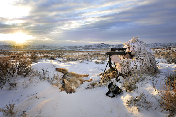 Even with the increased activity as the mating season goes on, Lundberg finds that winter coyotes require some long-distance shots, so he makes sure he packs his shooting sticks.