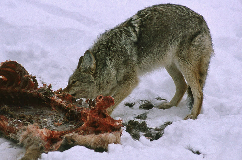 As winter goes on, carrion becomes a huge food source for coyotes. Studies in Wisconsin found that about half the food eaten by coyotes in the state’s southeastern counties during the deep winter months was carrion from livestock and poultry operations. In northwestern Wisconsin, similar research discovered that more than a third of the coyote’s winter diet was from deer carcasses. Landmark coyote research performed in the early 1980s at the University of Colorado by wildlife biologists Marc Bekoff and Michael Wells revealed that hunter-killed elk carrion provided the bulk of coyote forage during February and March in Grand Teton National Park in northwestern Wyoming.