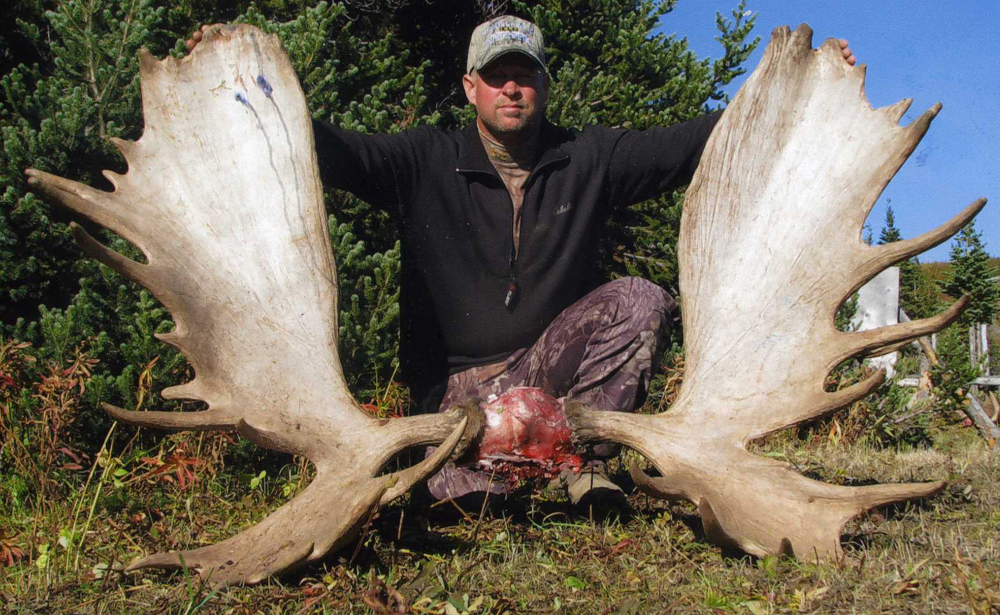 Location: Tatshenshini River, BC Grant traveled to the Tatshenshini River in British Columbia for moose and mountain goat. He bagged a goat shortly after his feet hit the ground. He and his guide lounged around in camp after packing the goat out, and the next September morning was cold and still. They glassed up this bull the guide had seen two years prior, and they started grunting. The bull heard them and slowly took his time to come in. It was an hour before the guide and Grant wondered if they should pack it in, but then the moose parted the willows. Grant waited until he was 40 yards away and shot him twice. While they field-dressed it, two more bull moose stood watch. Boone & Crockett Club