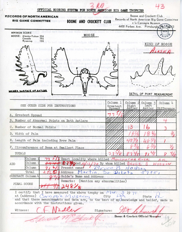 Location: McGrath, AK No one, it seems, is ever looking for a world record moose; they just find one and shoot it. At least that's the case for the top three Alaskan/Yukon moose. When Kenneth Best and hunting partner Art Beatie left camp near McGrath, Alaska, they did so in a 12 ft raft with a 12 ft ceiling of gray, wet clouds hanging over the willows. After a couple hours of floating and some unsuccessful forays onto shore to call for moose, they rounded a bend a saw this monster moose on a sandbar. They floated to within 75 yards and the moose vanished. Both men hit the ground and spilt up. Best found the moose browsing not 40 ft away from him, just opposite a patch of willows. He filled his scope with brown fur and shot the bull in the shoulder. He followed-up with a shot in the neck and spent the rest of the day wrestling that massive rack through the willows to the boat. Boone & Crockett Club