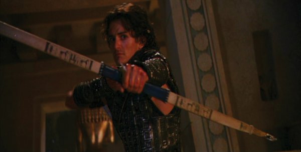 Dwayne "The Rock" Johnson's Mathayus the Scorpion King's bow has the power of a cannon. Bad guys don't get pierced by The Rock's arrows – they get blown backward and through walls. I hope he has a pretty hefty let off on that thing. Coolest shot of the flick? The Scorpion King pulls an arrow out of his back, nocks it and kills his nemesis.