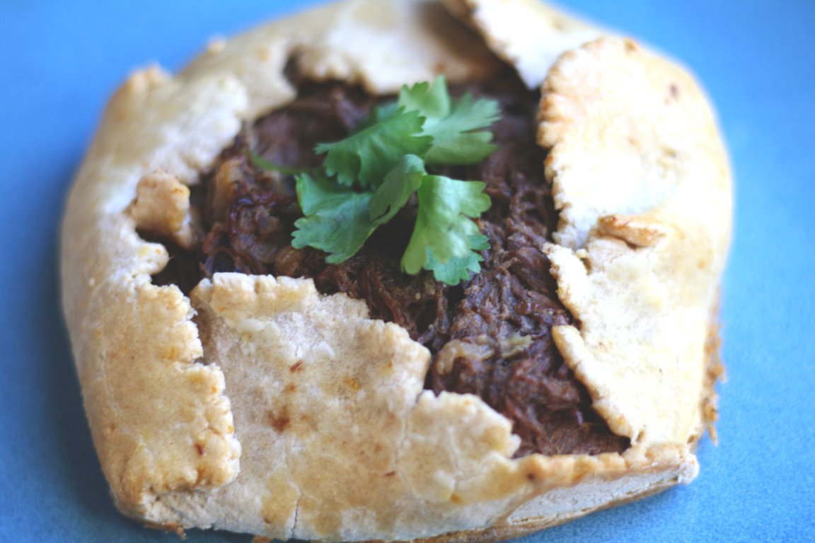 Divide the dough into four equal portions and roll them out into round flats. Spoon the duck mixture over the dough equally, then fold up the edges around the pies. Place the pies on a well-greased baking sheet and brush the edges with the egg wash, then bake in the oven at 400 degrees for 25 minutes.