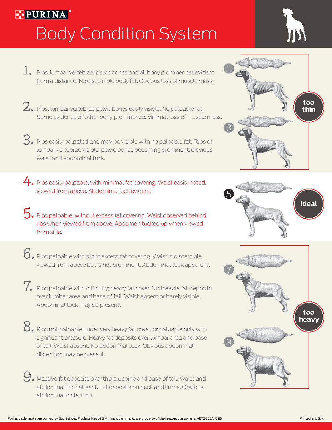 “You want to keep the working dog on a performance food all year round, but when they’re not working, feed less,” said Dr. Zanghi. “Feed to an ideal body condition, which isn’t just reflective of weight. You can use the Purina Body Condition Score or check with your vet.”