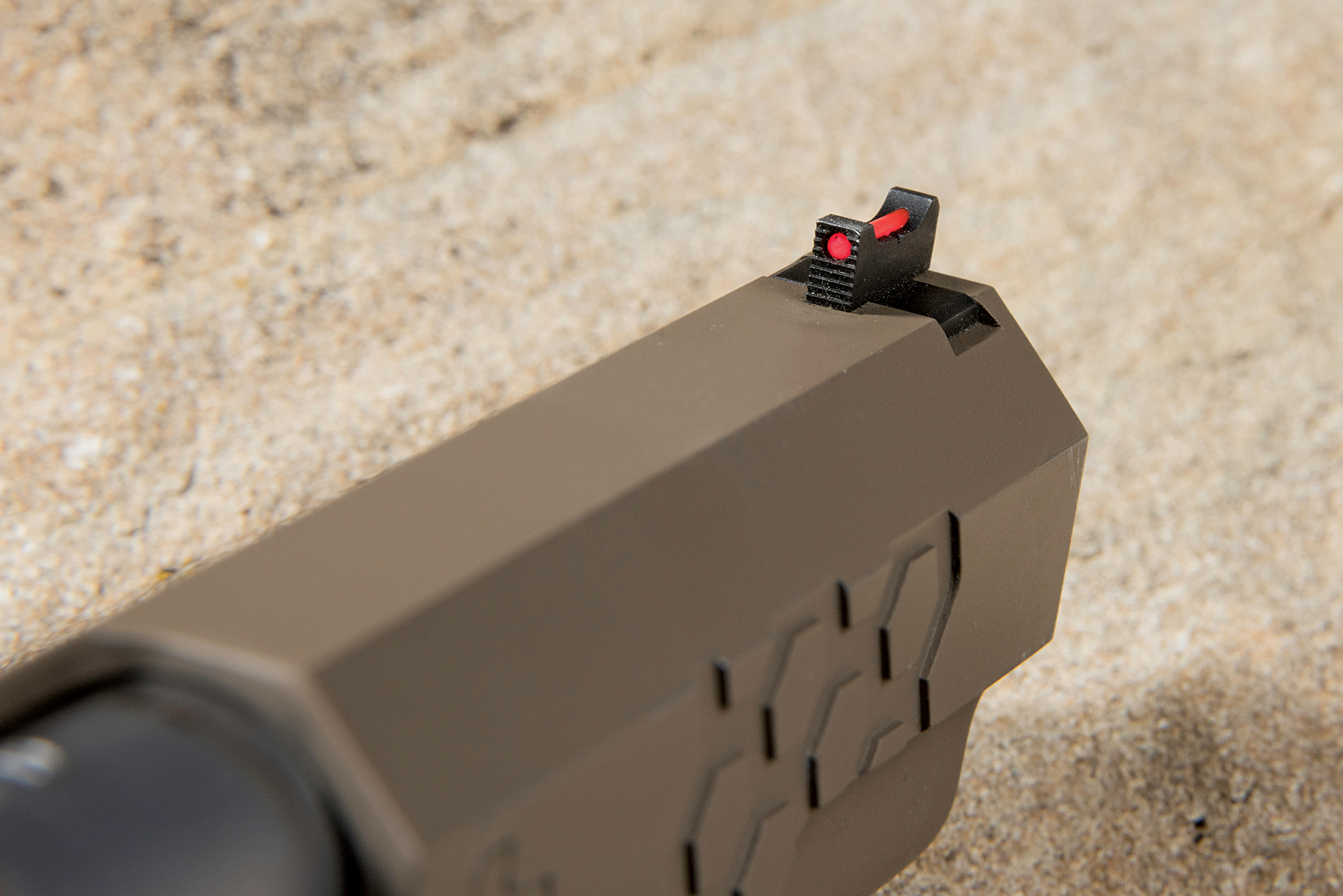The pistol is finished in a desert tan and OD green pattern. The Cerakote metal holds up to hard use, though it will show signs of holster wear after a time. The standard color for the Hex Tactical is black, but you can order other colors, and configure the gun the way you like, via STI’s custom shop.