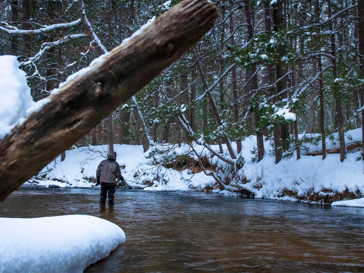 As might be apparent, line control, both during and after casting, is critical here, so I like a traditional trout line for this sort of fishing: think a Scientific Angler MPX or Rio Gold, which both have substantial rear tapers for manipulating your fly at distance. What you don’t want is an aggressive weight forward head and thin running line. A lot of modern streamer lines of this sort are designed with boat fishing in mind—long-distance casts where the fly line is shot after building extreme line speed rather than shorter casts where the fly line is laid down after being carefully aerialized. Presentation-wise, the winter wading angler borrows much from the dry fly angler who stalks into position, studies the scene and makes that one good presentation that counts.