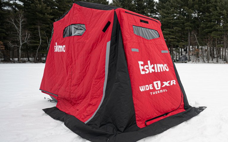 As of this winter, I’m now in love with the Eskimo Wide 1 XR Thermal 1-person flip shelter, which offers tons of headroom, elbow room, and square footage. A single bottom pole expands the framework at the push of a button to accommodate a massive 17.5 square feet of fishable area—enough space for three holes—one for forward-facing sonar, one for a jigging rod, and one for a deadstick or ceiling-pole-mounted rattle reel.