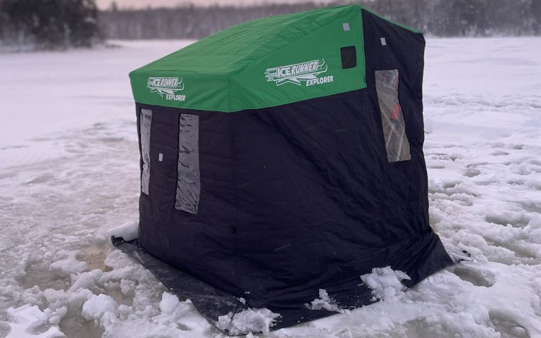 This shack tested great on a Northern Minnesota lake in a -30 degree windchill. I hand-pulled it out with the auger, my tackle, bait, and heater in the provided sled. Even through foot-deep snow, with some 6 inches or more of slush trapped underneath, I had no issues dragging the 49-pound Ice Runner Ice House Explorer out to my spot. My buddy “Big Mike” and I fished comfortably in it, which is surprising considering we’re both over 6 feet tall and similarly wide individuals. Once back to the garage, I built a floor out of the same 1-inch foam exercise mats I use for my camping hubs. In terms of a lightweight, two-man shelter, with a reasonable price tag, the Ice Runner Explorer is it.