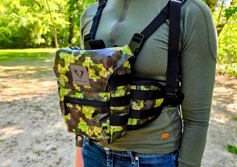This bino harness from Forloh is designed, sourced, and manufactured entirely in the good ole USA. Although this one is intended for binoculars, it can easily pull double duty as a minimalist turkey chest rig. It features a padded cellphone pocket, a convenient magnetic snap closure on the bino pouch, and heavy-duty YKK Aquaguard zippers. Leave the binos at home, and the main compartment is roomy enough for all your calls, as well as a face mask, gloves, water bottle, and some energizing mid-hunt snacks. The sides are also covered in MOLLE webbing so you can easily add Forloh accessories, such as the brand’s rangefinder holster.