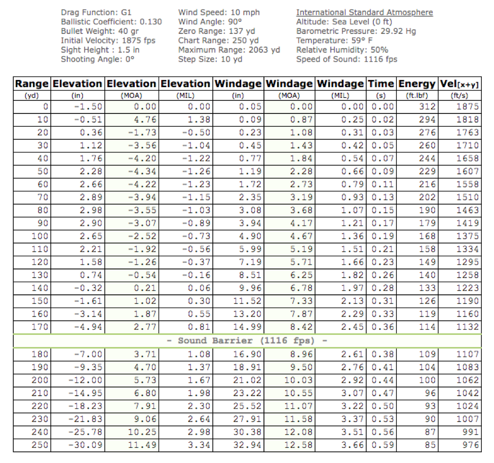 While the .22 WMR’s, 40-grain jacketed hollow point launched around 1,900 fps sounds impressive to a .22 LR shooter, it does not prove ideal for truly long range work due to its bullet shape. The flat-nose and round-nose bullets typically seated atop a .22 Mag incur a lot of drag. This costs them velocity and energy. Let’s run a trajectory table base on CCI’s 40-grain GamePoint load rated 1,875 fps. This bullet, while anything but long and sleek, has one of the best B.C. ratings among .22 WMR bullets. Here’s how it flies when zeroed for MPBR on a 2-inch diameter target zone.
