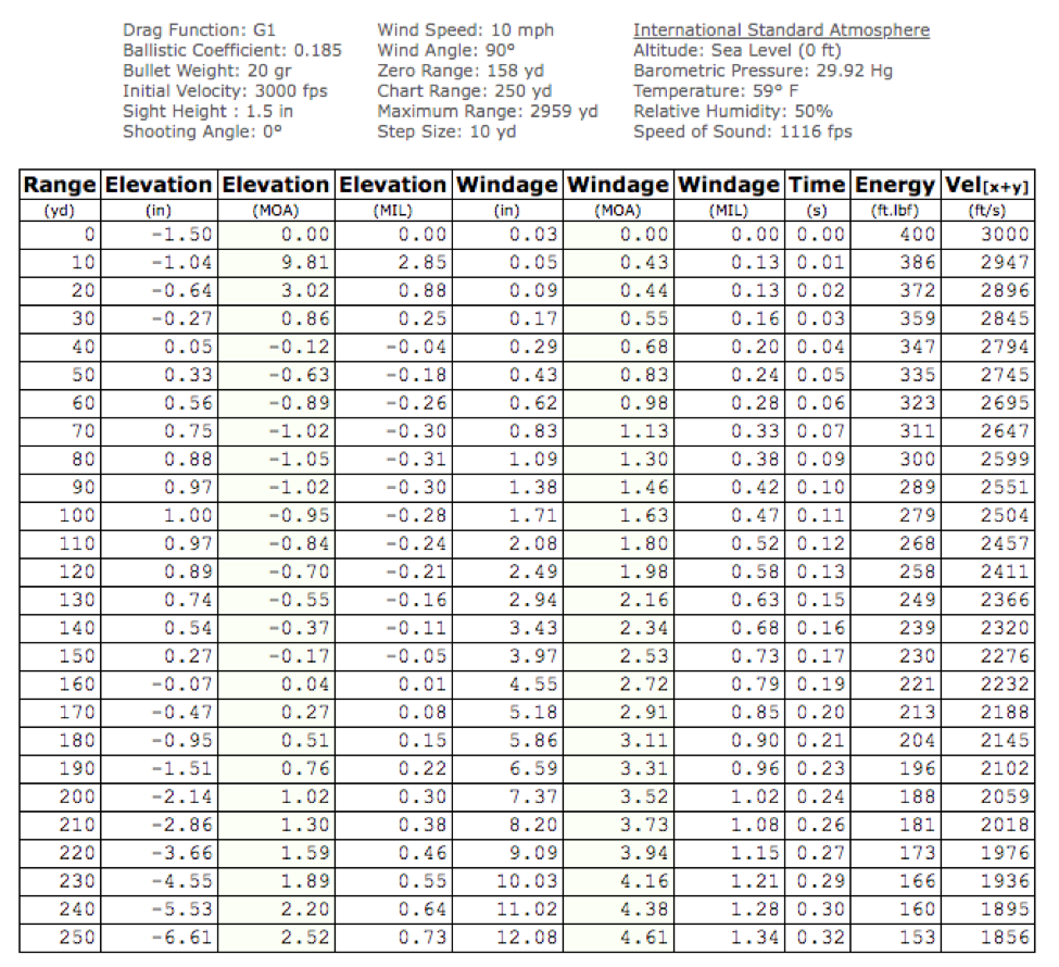 That said, a broadside coyote offers a much larger vital zone than 2 inches. A 6-inch circle would be about right. This means even a 2 MOA 22 WMR would keep its bullets inside the kill zone at 125 yards, 150 yards, even 200 yards. And maximum point blank range could be extended to about 160 yards, as this table indicates. Of course, the wind deflection problem persists. And there is the issue of declining energy. Exactly how many ft-lbs are required to terminate a coyote is a moot point.